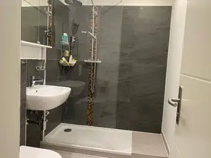 Ein neues mit großer bodentiefer Dusche gestaltetes Bad.