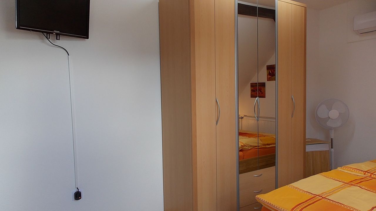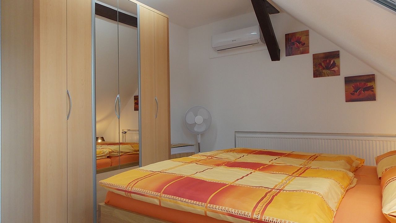 Ausstattung Schlafzimmer: Doppelbett aus Massivholz (Matratzen mit unterschiedlichem Härtegrad. Bettwäsche (Erstausstattung) ist vorhanden und inklusive), zwei Nachttische, Kleiderschrank, Schreibtisch, Sonnen- und Insektenschutzplissee, Klimaanlage, Sat-TV und -Radio.
