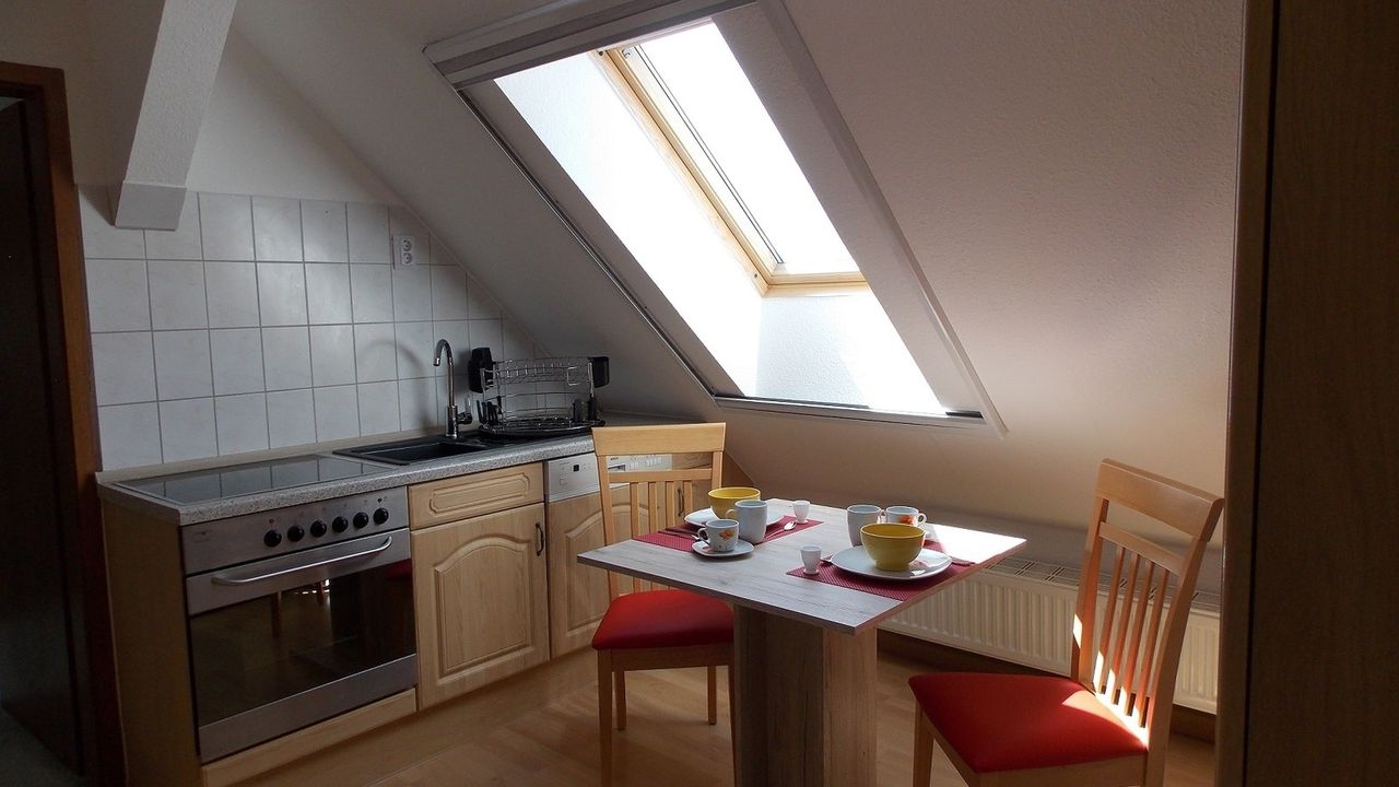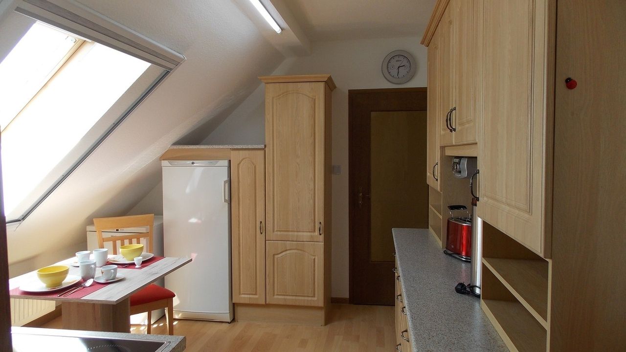 Ausstattung Obergeschoss (über Treppe zu erreichen): modern eingerichtete Landhausküche, Badezimmer, Wohnbereich und Schlafzimmer.