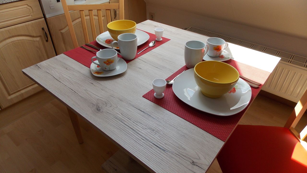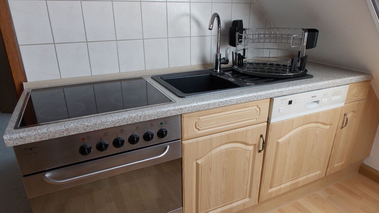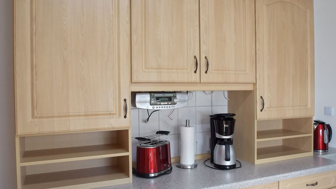 Ausstattung Landhausküche: Essplatz, Kühlschrank, Tiefkühlschrank, Kaffeemaschine, Toaster, Wasserkocher, Küchenradio, Einbauspüle, E-Herd, Geschirrspüler, Abfallbehältnisse zur Mülltrennung, Sonnen- und Insektenschutzplissee, Dinge für den täglichen Hausgebrauch (Töpfe, Pfannen, Geschirr, Besteck, Schneidbretter, Staubsauger etc.), Küchenwäsche (Erstausstattung) ist vorhanden und inklusive.