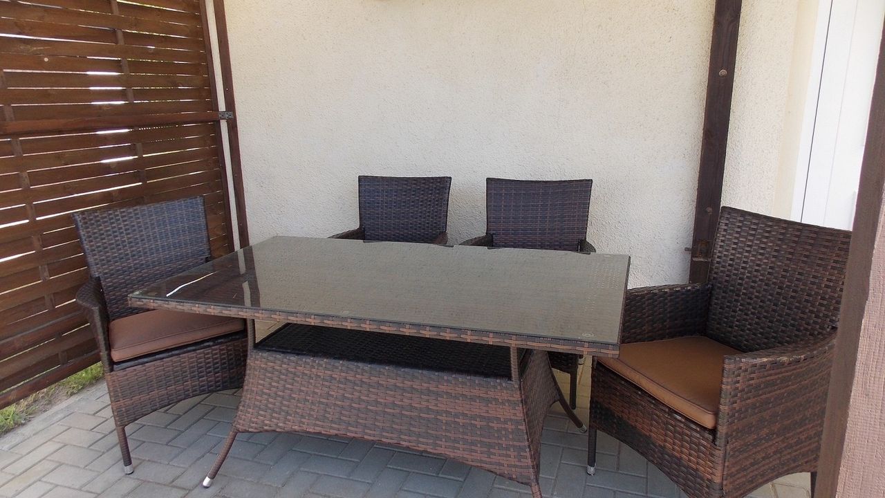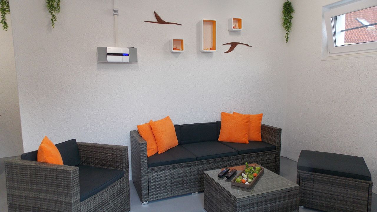 Ausstattung Wohnzimmer: Schlafcouch (Aufbettungsmöglichkeit, Utensilien und Bettwäsche zur Aufbettung sind vorhanden), moderne Wohnwand, Couchtisch, Sonnen- und Insektenschutzplissee, Ventilator, Sat-TV und -Radio, DVD-Player mit einer DVD-Auswahl verschiedener Filmgenre, Bücher sowie eine kleine Gesellschaftsspielesammlung