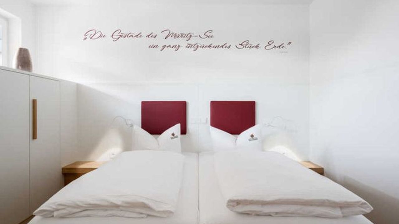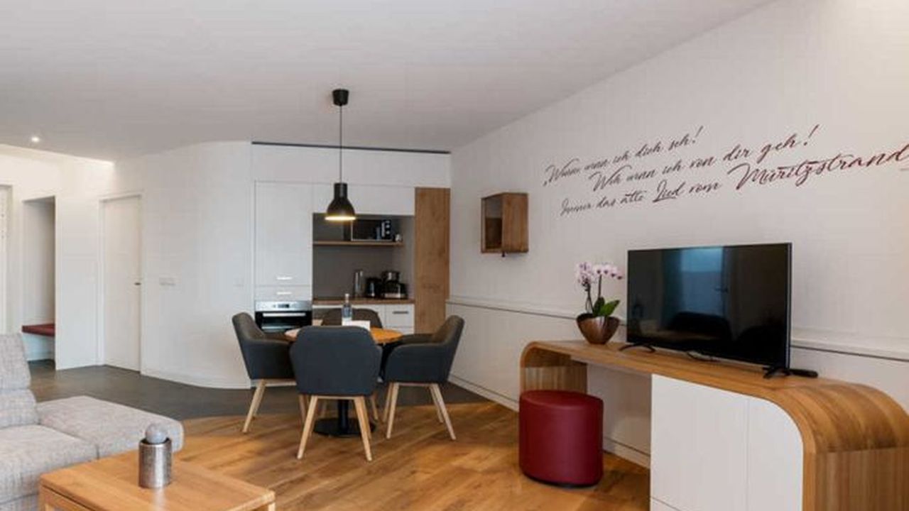 Die Suite Kuhtränke befindet sich im Obergeschoss des Hauses und verfügt über einen Schlafbereich und einen kombinierten Wohn-/Essbereich mit offener Küche und einen Balkon: 5 qm (Müritzblick). Extras: Bad mit Dusche und WC, Sat-TV, Radio, Tresor, vollausgestattete Küchenzeile, Essecke, Haartrockner. Eine Aufbettung für die 3. Person erfolgt im Wohnbereich auf der Couch. Bei Anreise sind Bettwäsche und Handtücher sowie eine Flasche Wasser zur Begrüßung vorhanden.Sonstiges