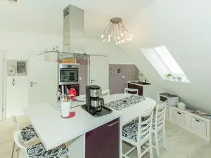 Eine große und interessant aufgeteilte Küche bildet den Mittelpunkt der Wohnung und hat den Essbereich für 4 Personen integriert. Auch finden Sie hier ein Geschirrspüler, ein Induktionskochfeld und weitere Annehmlichkeiten vor. Im Wohnbereich mit 2 Sofas, einem Sessel und dem mittig stehenden Kamin lassen sich auch im Herbst und Winter gemütliche Abende verbringen. Der TV mit DVD Spieler und einer Playstation 4 wird sicherlich nicht nur die Jüngeren erfreuen. Eine Garderobe finden Sie direkt im Eingangsbereich vor.