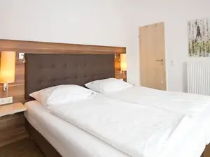 1x Schlafzimmer mit Tür, zwei maßgefertigten Einzelbetten, eigenem TV, Leselampen und Steckdosen direkt am Bett