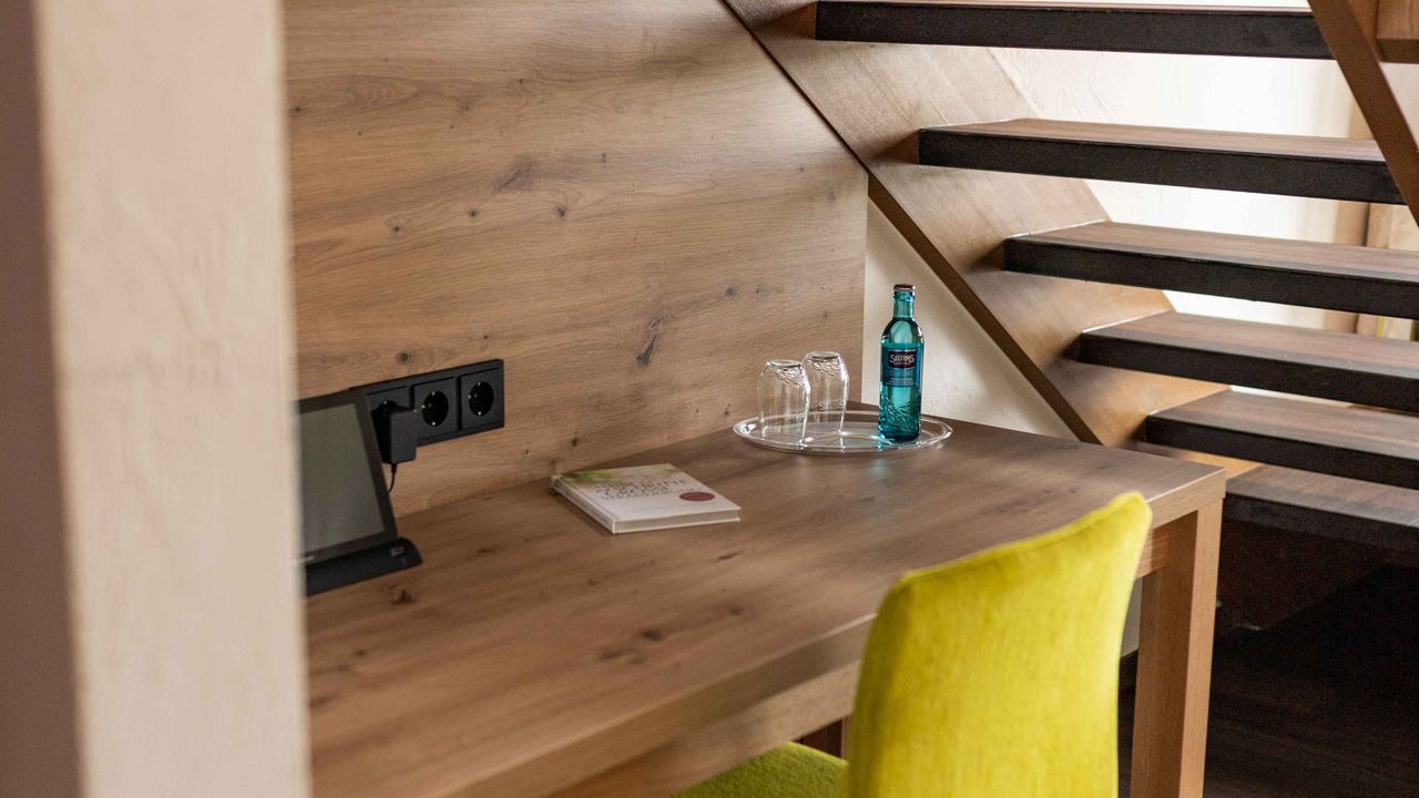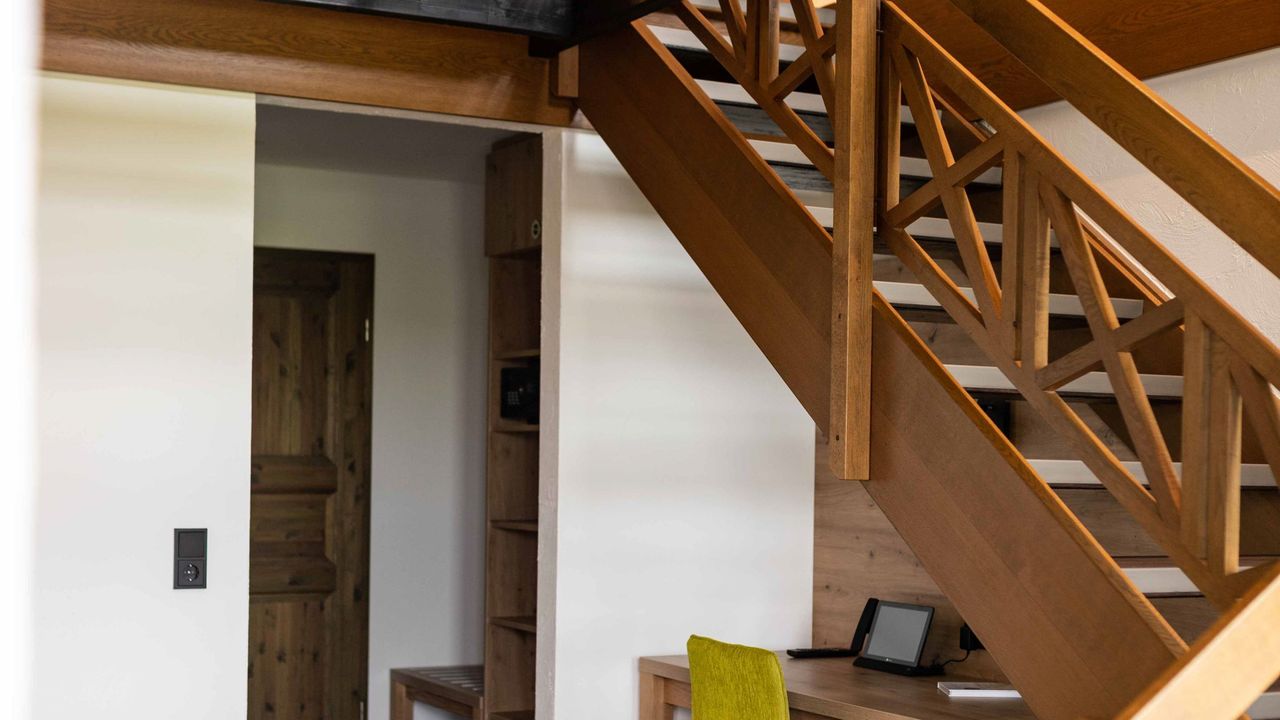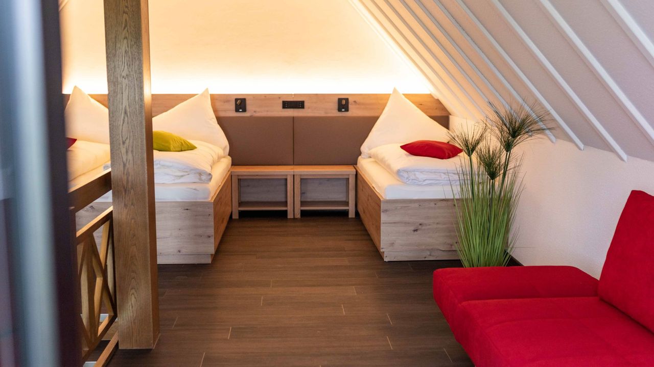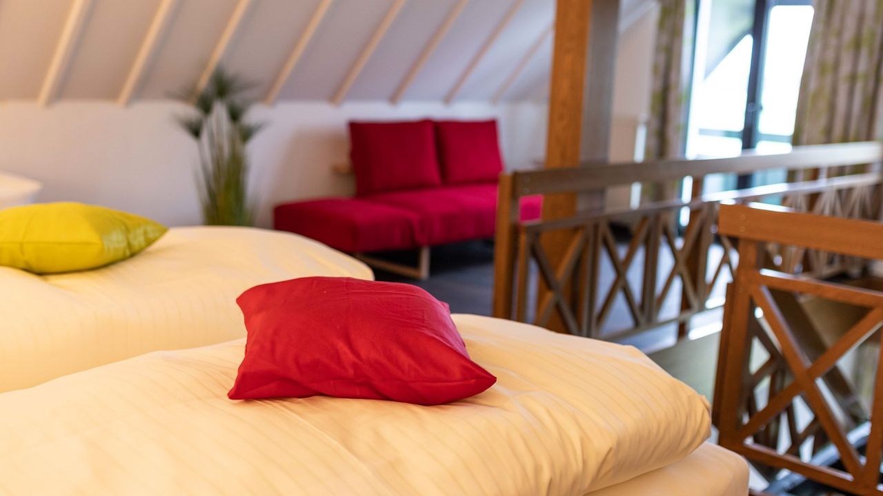 Das großzügige Zimmer über zwei Etagen verfügt über zwei Balkone und bietet Platz für 4 Personen. Die helle und freundliche Einrichtung heißt Sie mit roten und grünen Farbakzenten willkommen. Entspannen Sie sich in der gemütlichen Sitzecke und lassen Sie die Seele baumeln. Das moderne Badezimmer ist mit einer ebenerdigen Dusche, einem Handtuchwärmer sowie einem separaten Kosmetikspiegel und einem Föhn ausgestattet. Die digitale Gästemappe auf dem Schreibtisch hält Sie mit aktuellen Informationen und Tipps für Ihren Aufenthalt auf dem Laufenden.Beschreibung der Unterkunft