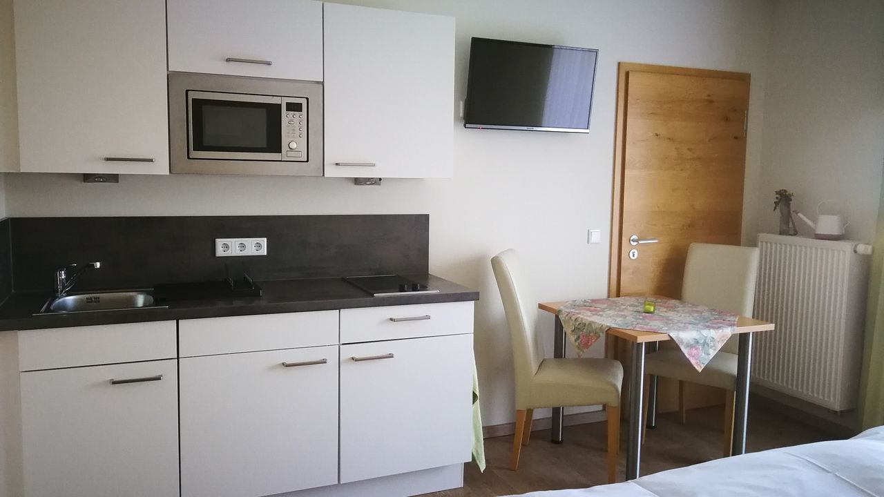 Es steht Ihnen eine gut ausgestattete Küchenzeile mit 2er Ceranfeld, Spüle, Mikrowelle, Kaffeemaschine, Wasserkocher und Kühlschrank zur Verfügung. Ein Esstisch und zwei Stühle sind vorhanden. Das Doppelbett kann auch als Einzelbetten gestellt werden. Bei Buchung bitte angeben wie sie es wünschen. Das Badezimmer ist mit Dusche und WC eingerichtet.Durch die große Glastür kommen sie auf den Balkon. Dieser ist gartenseitig mit Morgensonne und Sitzgelegenheit.
