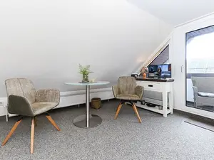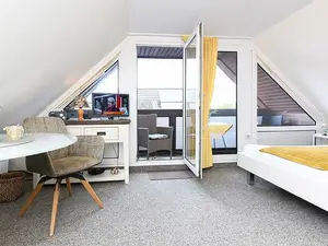 Größe ca. 25 Quadratmeter, Wohn- und Schlafraum mit integriertem Küchenbereich, Badezimmer mit Dusche, Waschtisch und WC, Obergeschoss, Loggia (überdachter Balkon), optimal für 1 Person.Von der Loggia genießen Sie eine tolle Aussicht auf den Deich und die Nordsee!