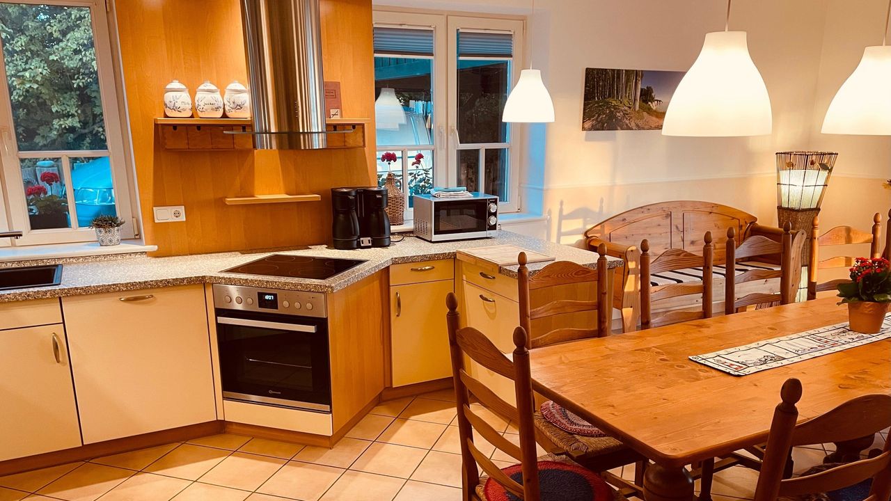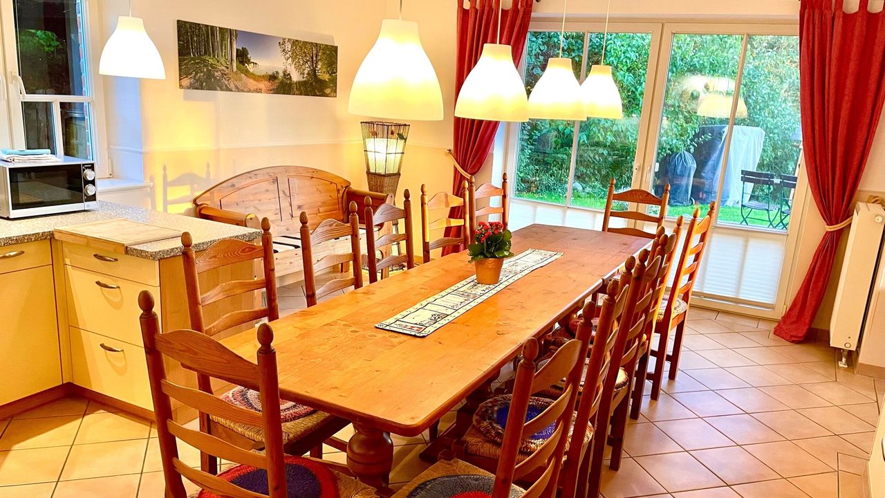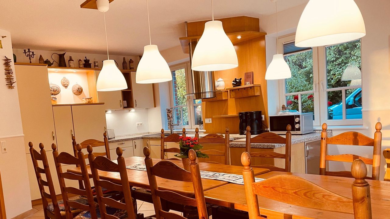 Das Erdgeschoss: Die Wohnküche hat ca 25 qm Platz und einen großen Essbereich für bis zu 13 Gäste. Es gibt bodentiefe