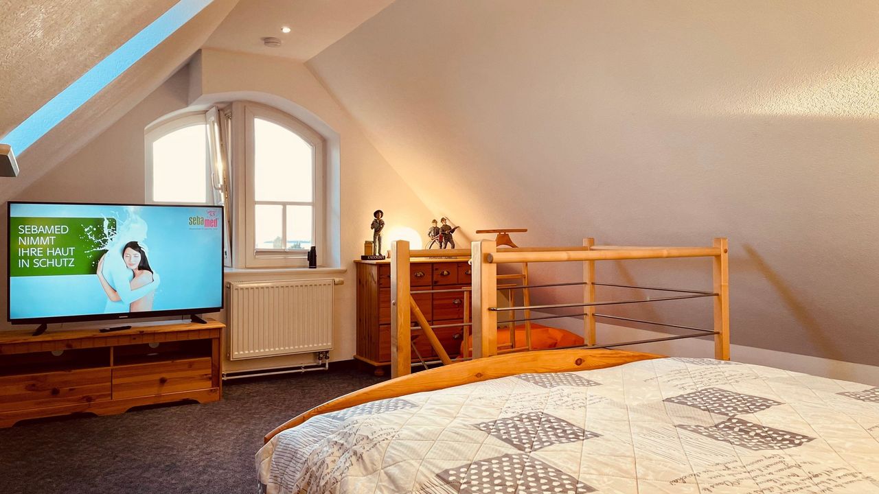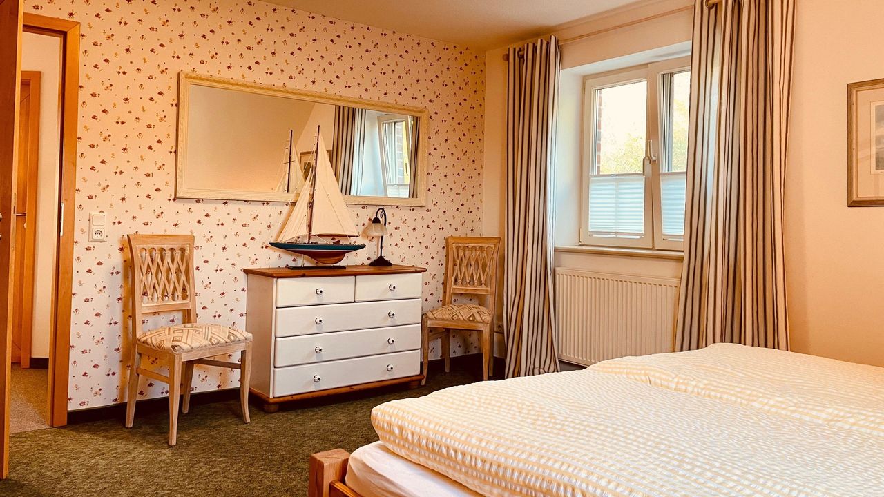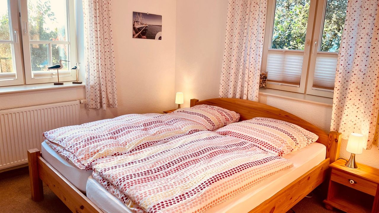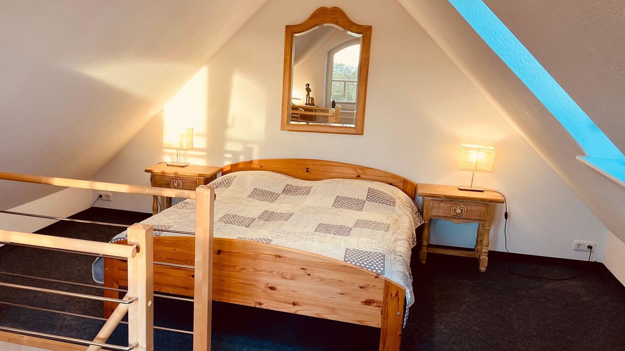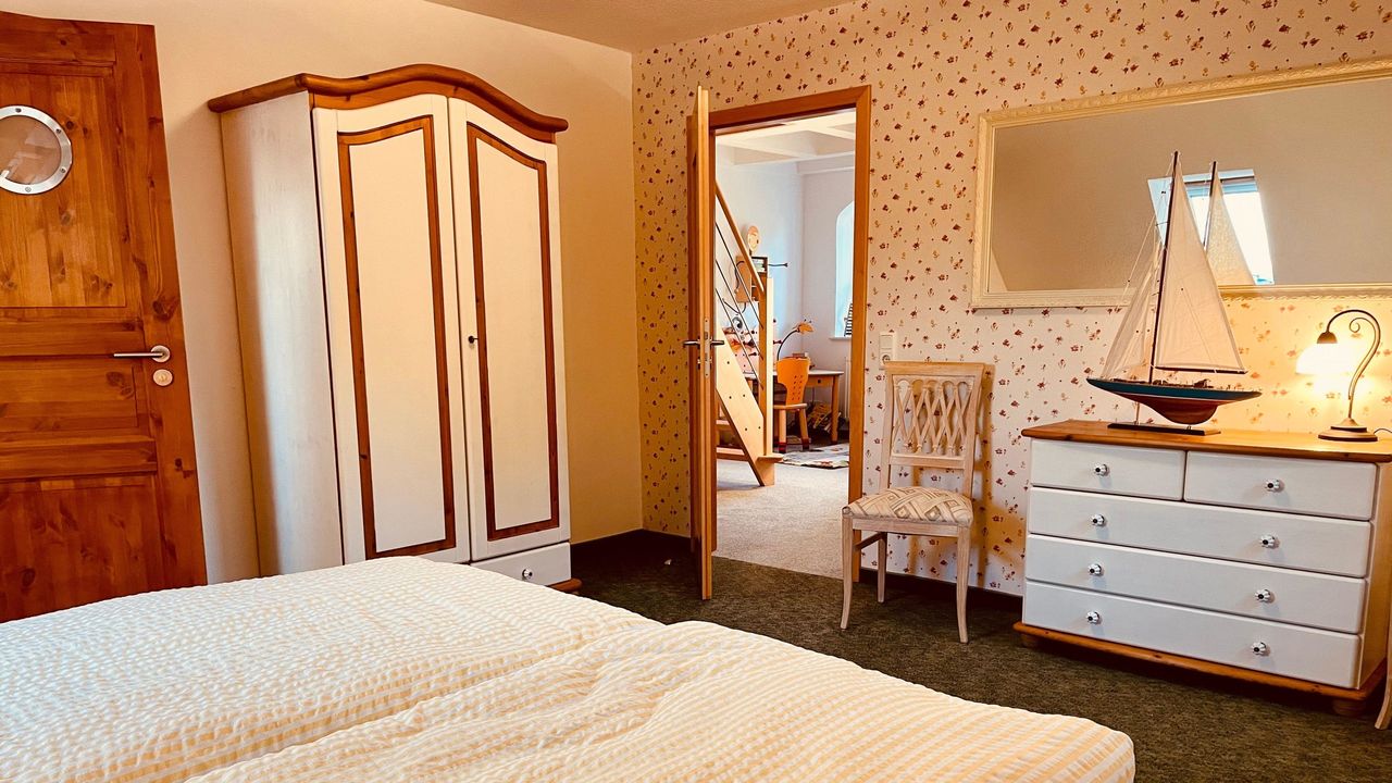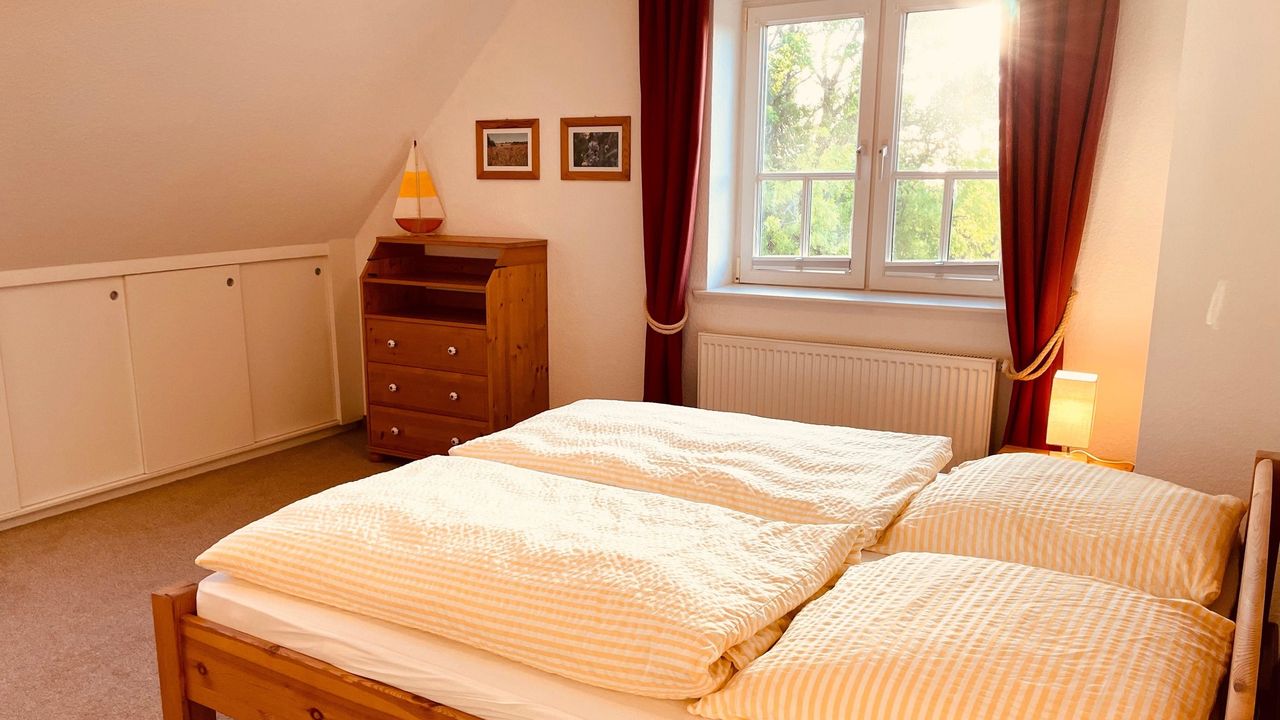 Hier finden Sie einen großen Flur mit einer Galerie/ Leseecke und schönem Ausblick aus dem Gaubenfenster in Richtung Norden & Westen zur Insel Hiddensee. Auf dieser Etage gibt es ein geräumiges Elternschlafzimmer mit angrenzendem Juniorzimmer (Einzelbett) , dazu ein großes Kinderschlafzimmer mit ca 13 qm. Ein weiteres Kinderschlafzimmer bietet Platz über 2 Etagen mit insgesamt 20 qm für 4 Gäste. Ausserdem haben Sie ein großes Bad mit Badewanne, Dusche, 2 Waschbecken, ...... Alle Zimmer haben Fenster mit Insektenschutz.