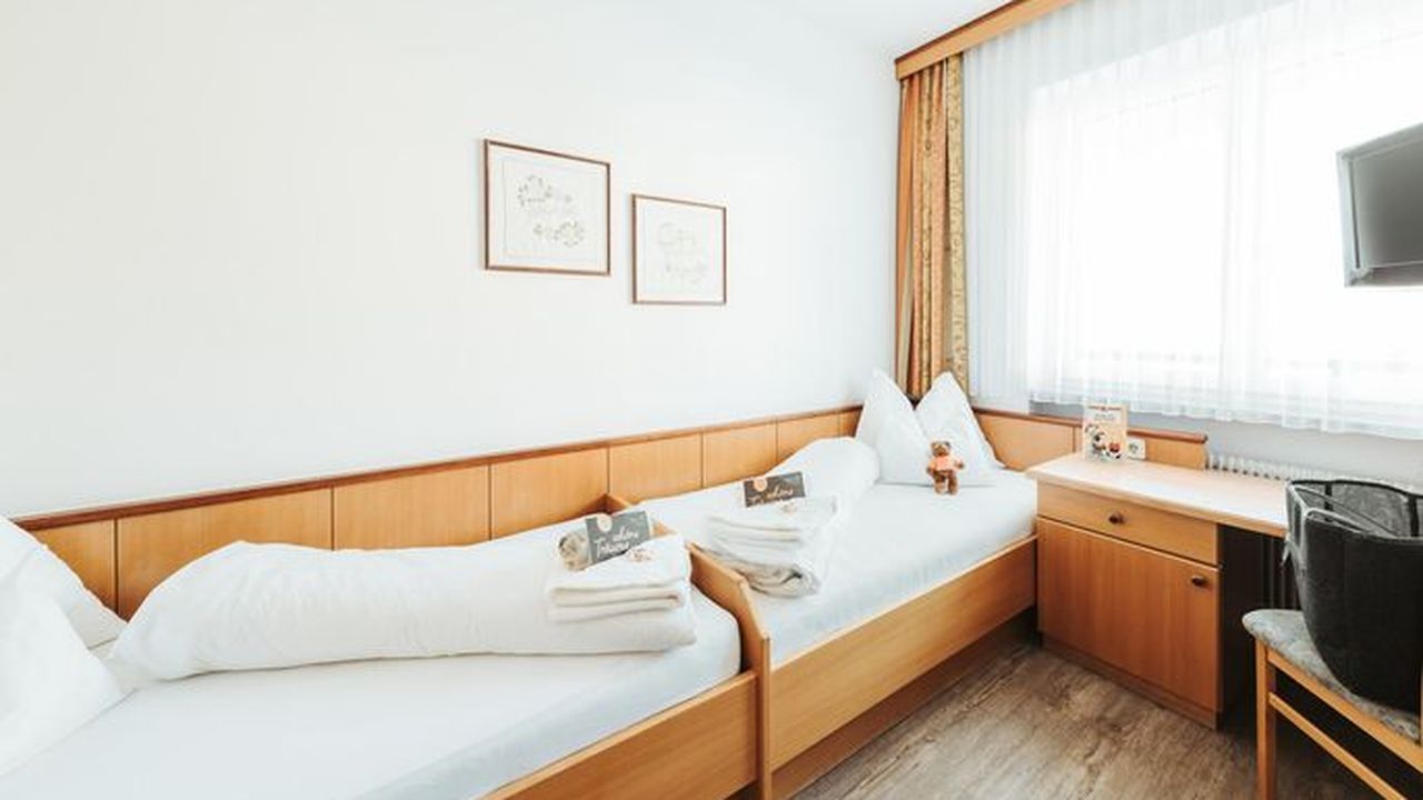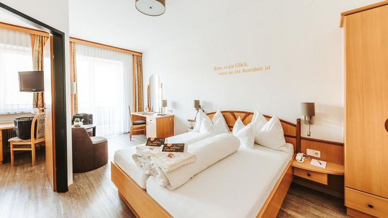 Zur absoluten Familienzeit werden Ihre Urlaubstage in unserem Familienzimmer. Das Zimmer bietet separate Eltern- und Kinderschlafzimmer und somit ausreichend Platz für alle. Vom Elternschlafzimmer geht es auf den sonnigen Westbalkon, wo beim Sonnenuntergang bei einem Glas Wein der Tag Revue passiert werden lassen kann.Ausstattung