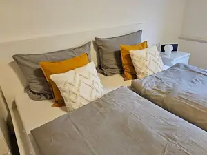 2 Schlafzimmer mit Doppelbetten 1,80 x 2,00 Meter, Nachtkonsolen, Kleiderschrank, Leselampe, Radiowecker (1 Schlafzimmer mit TV), Bettwäsche wird gestellt.