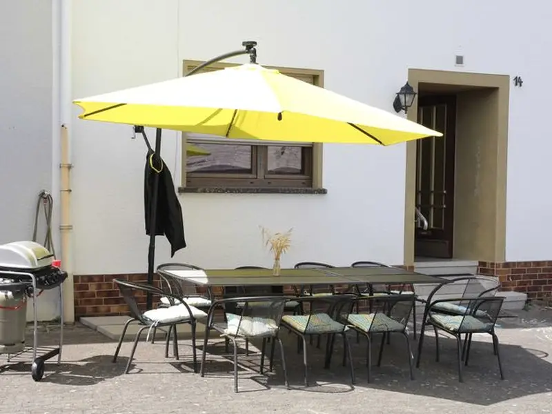 Vor dem Haus gibt es Sitzgelegenheiten mit Sonnenschirm sowie einen Grill.