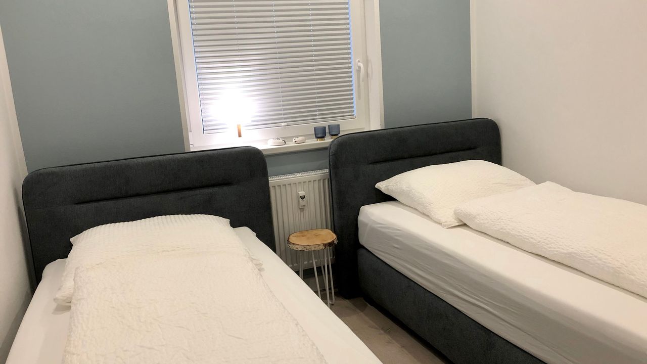 Eines der beiden Schlafzimmer ist mit einem Doppelbett ausgestattet, das andere mit zwei einzelnen Boxspringbetten.