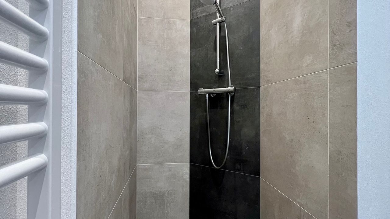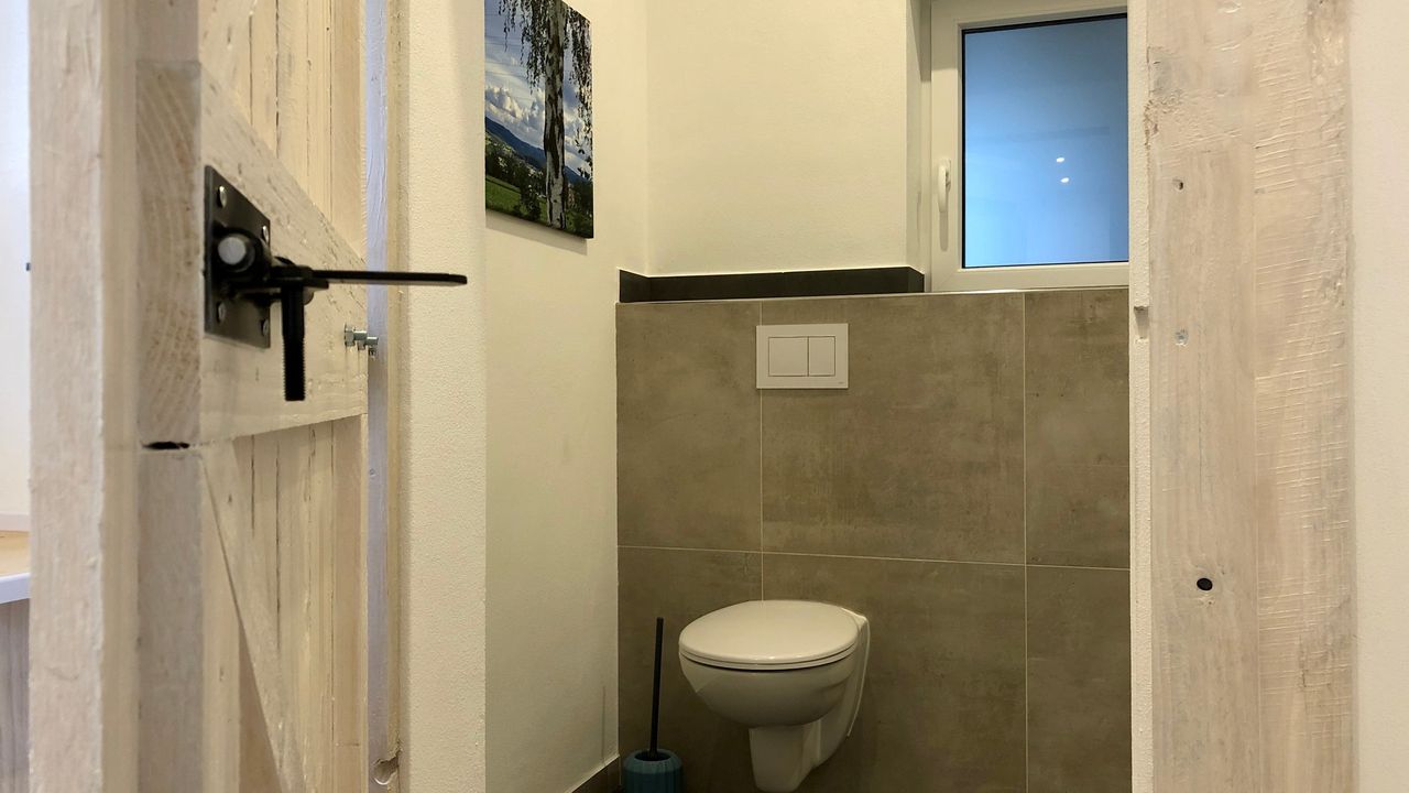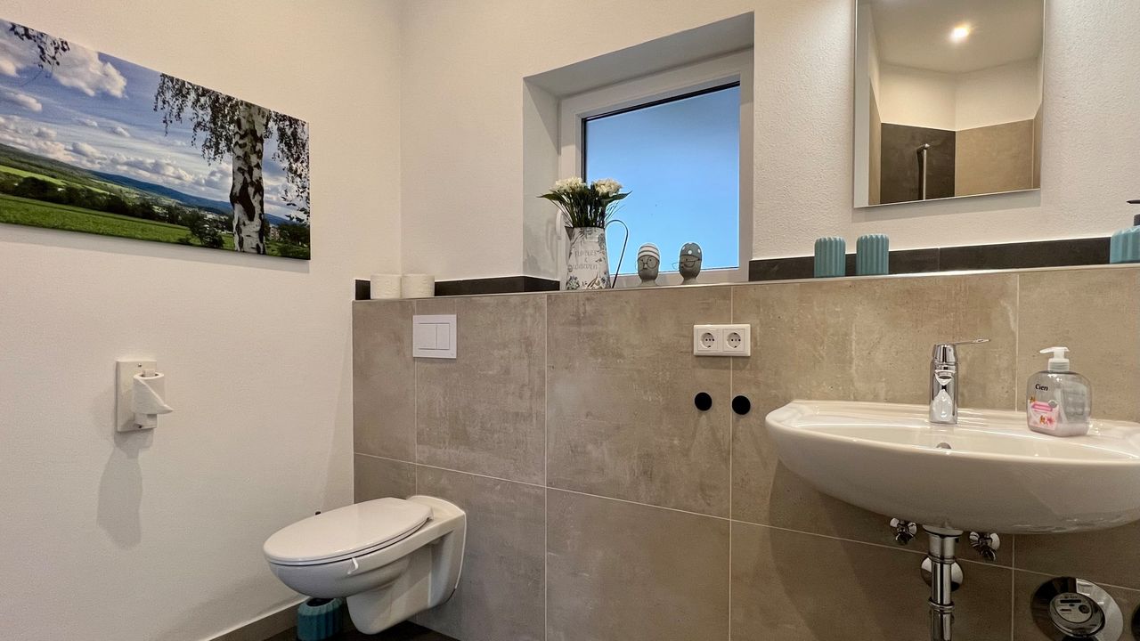 Unsere Ferienwohnung verfügt über ein Bad mit WC und einer begehbaren, offenen Dusche.