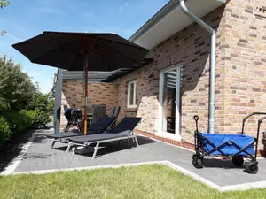 Das Haus verfügt über eine überdachte Terrasse mit Grill und zwei Sonnenliegen. Im schönen angelegten Garten steht eine Doppelschaukel und ein Sandkasten für die Kinder bereit.