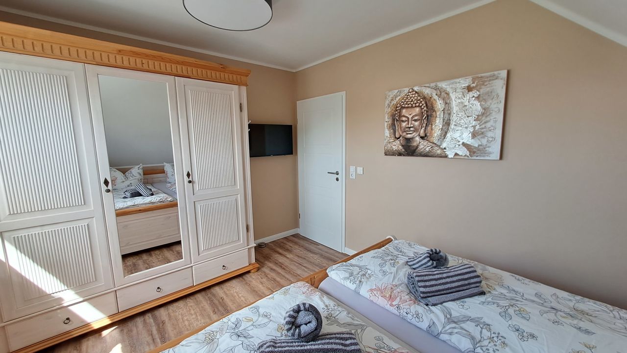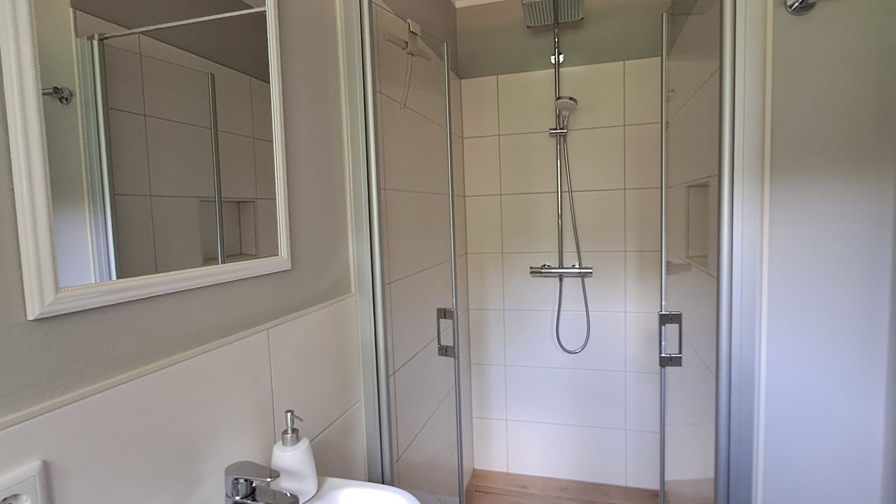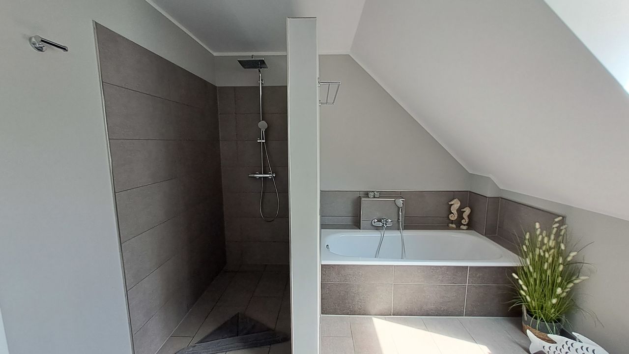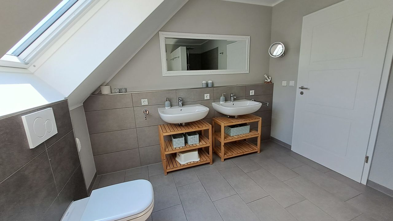 Im OG befinden sich 2 Schlafzimmer mit Doppelbetten(180x200), Smart TV und viel Stauraum. Ein weiteres Schlafzimmer verfügt über zwei Einzelbetten (100x200). In allen Schlafzimmern befindet sich ein Insektenschutz. Das moderne Tageslichtbad besticht durch eine große begehbare Rainshowerdusche, Badewanne und einen Doppelwaschtisch. Zusätzlich befindet sich im EG ein zweites Bad mit WC und begehbarer Rainshowerdusche.