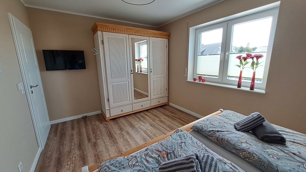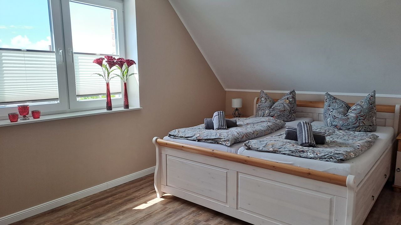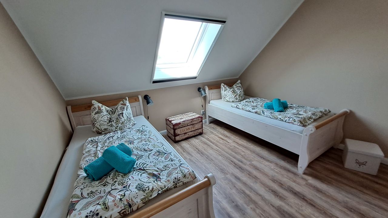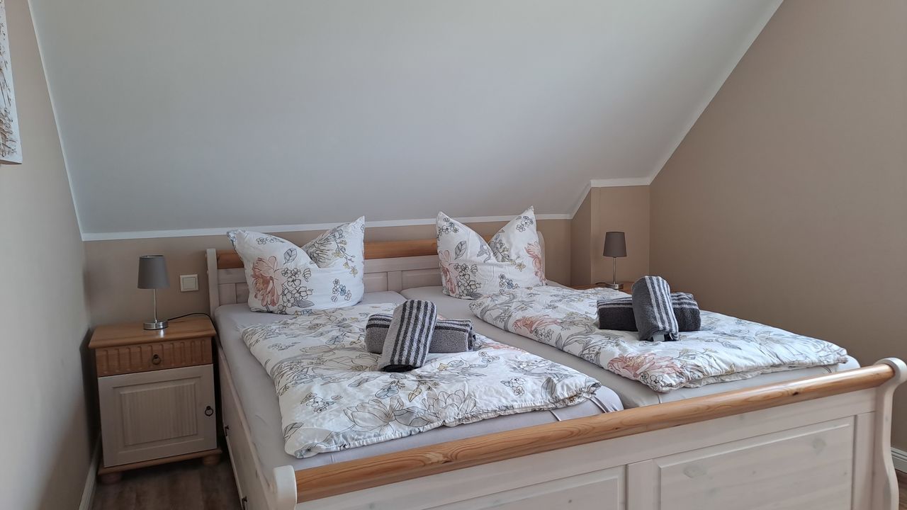 Im OG befinden sich 2 Schlafzimmer mit Doppelbetten(180x200), Smart TV und viel Stauraum. Ein weiteres Schlafzimmer verfügt über zwei Einzelbetten (100x200). In allen Schlafzimmern befindet sich ein Insektenschutz. Das moderne Tageslichtbad besticht durch eine große begehbare Rainshowerdusche, Badewanne und einen Doppelwaschtisch. Zusätzlich befindet sich im EG ein zweites Bad mit WC und begehbarer Rainshowerdusche.