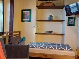 Dieses 15 m² kleine Studio mit Meerblick ist besonders für Einzelpersonen geeignet, die die meiste Zeit ihres Aufenthaltes die schöne Insel erkunden aber auch mal gerne eine Kleinigkeit im Zimmer kochen möchten. Es liegt im ersten Stockwerk zur Landstraße (Mehrfachverglasung). Das 135 cm breite Bett ist für eine Person sehr großzügig, zudem gibt es einen Tisch mit zwei bequemen Stühlen. Der Einbauschrank bietet genügend Platz für die mitgebrachte Kleidung. In der Kochnische können einfache Gerichte zubereitet werden. Das separate Badezimmer ist mit einer Dusche ausgestattet. Natürlich kann die große Gemeinschafts-Dachterrasse jederzeit genutzt werden. Der Flachbildfernseher verfügt über Satellitenempfang mit ca. 450 internationalen Sendern- darunter alle frei empfangbaren deutschen Kanäle - sowie durch Umschalten auf der Fernbedienung über DVB-T-Empfang mit den gängigen spanischen Fernsehsendern. Zudem kann auf Anfrage kostenlos Netflix bereitgestellt werden. Unser Haus verfügt über Internetanschluss per Glasfaser und in allen Unterkünften sowie auf der Dachterrasse steht sehr gut funktionierendes W-LAN zur kostenlosen Verfügung.Das Ferienwohnungshaus "Apartamentos Monasterio de San Antonio" ist ein sehr schönes, über 200 Jahre altes ehemaliges Klostergebäude mit typischem Innenhof, verwinkelten Treppen und einer großen Gemeinschafts-Sonnenterrasse mit herrlichem Blick auf den Atlantik und das Gebirge. Es ist ein gutes Beispiel kanarischer Baukunst. Bei der vollständigen Restaurierung im Jahr 1996 wurden Ursprünglichkeit und der Charme des Hauses vollständig erhalten. In diesem Jahr begann auch die touristische Vermietung der ersten Ferienwohnungen. Die meist jungen internationalen Gäste nutzen die Apartamentos Monasterio de San Antonio gerne als idealen Ausgangspunkt für Mountainbike- oder Wandertouren sowie für Ausflüge in die vielfältigen Regionen der Insel.