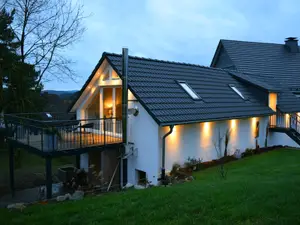 Unsere im September 2017 fertiggestellte Ferienwohnung "Auf´m Hühnerstall" befindet sich im Dachgeschoss eines kleinen separaten Nebengebäudes im Garten. Durch die Hanglage ist die Wohnung über eine kleine Treppe im Außenbereich erreichbar. Der 10 m² große Balkon mit Süd-Ost-Ausrichtung bietet einen freien Blick auf Wiesen und Wälder.Die 60 m² große Wohnung verfügt über einen geräumigen Wohn-Essbereich mit TV und gemütlichem Kamin, ein Schlafzimmer mit Boxspringbett und TV sowie ein Tageslichtbad.
