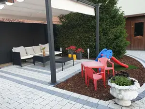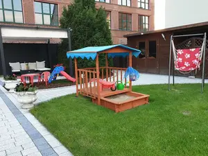 Für unsere kleinen Gäste bietet unsere familienfreundlichen Unterkunft: Hauck-Babybett mit Matratze, Hochstuhl, Kindertoilettensitz, Waschbeckentritt, Wickekunterlage, Kaputzenhandtücher, bei Bedarf Baby-Kosmetikartikel, Kinder-/Babygeschirr und Besteck, Kindersteppdecke & Kissen (extra leicht), Nachtlicht, Steckdosen-Sicherung, Spielzeug, Spielplatz mit Sandkasten, Rutsche, Wippe, Klettergerüst und Spieltisch, ein neuer kompletter Kombi-Kinderwagen inkl. Autoschale kann gegen eine Gebühr ausgeliehen werden.