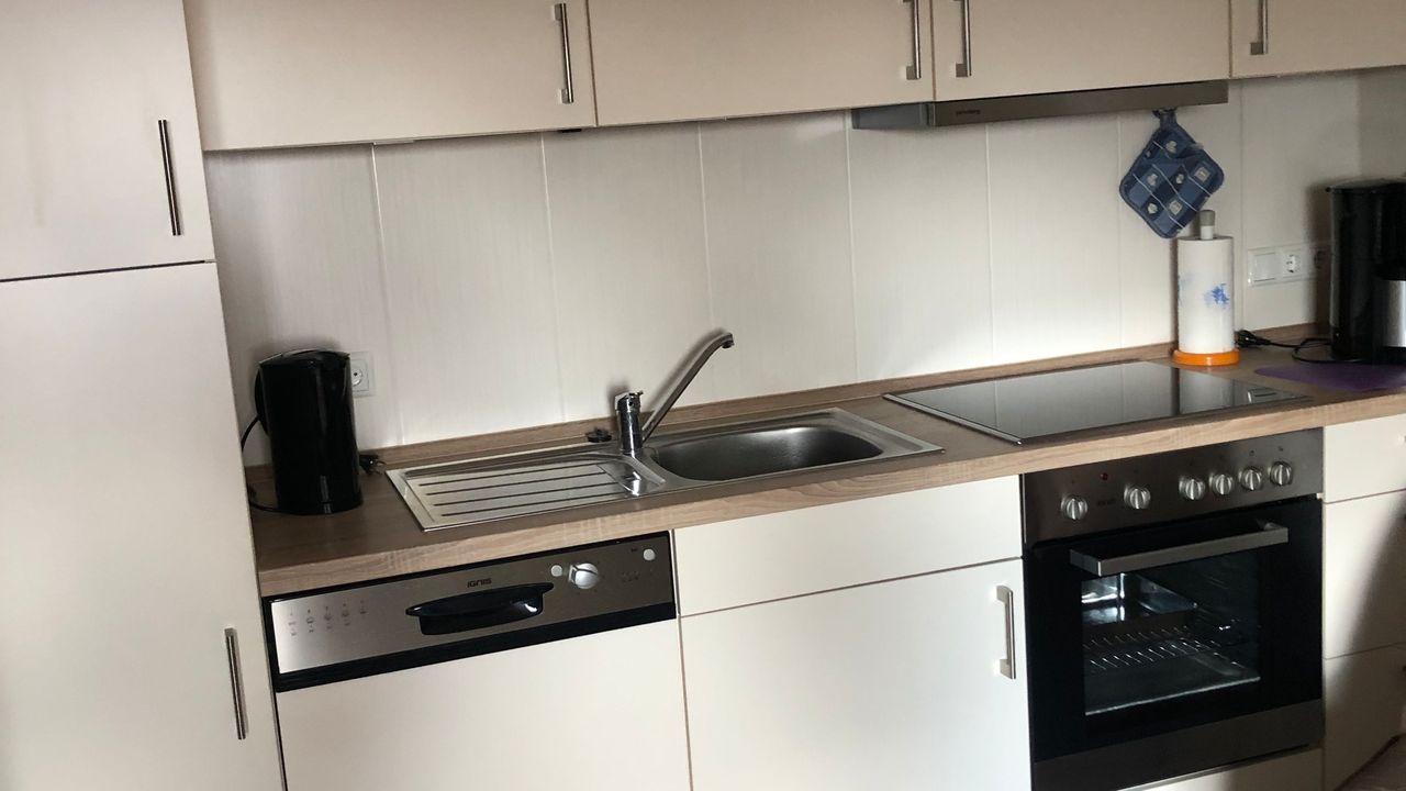 Im Erdgeschoß ist eine gut ausgestattete Wohnküche mit Spülmaschine und kleinem Gefrierschrank. Ein Fernseher sowie