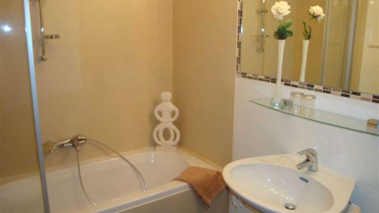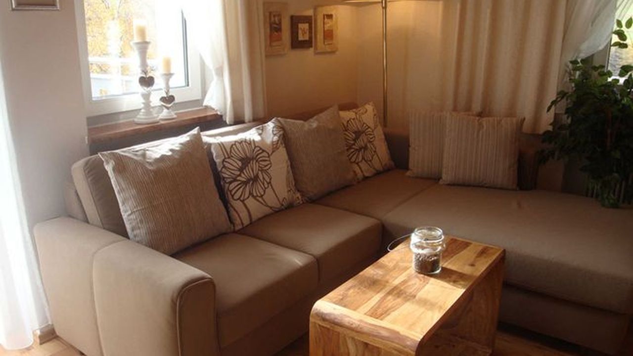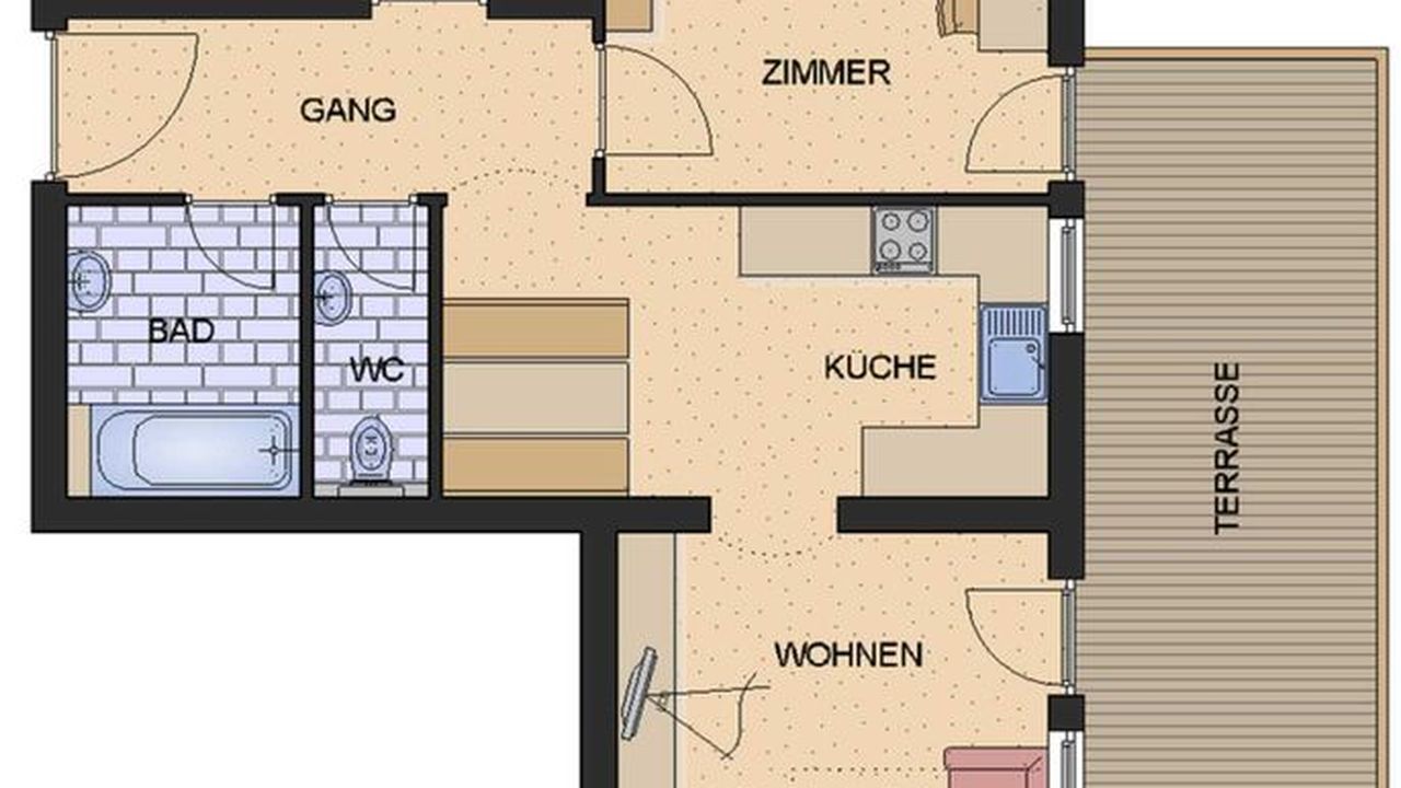Entrance hall with coat rack, spacious kitchen with dining corner, living room, 2 sleeping rooms, bathroom, seperate WC, balcony, satellite TV, cellar
