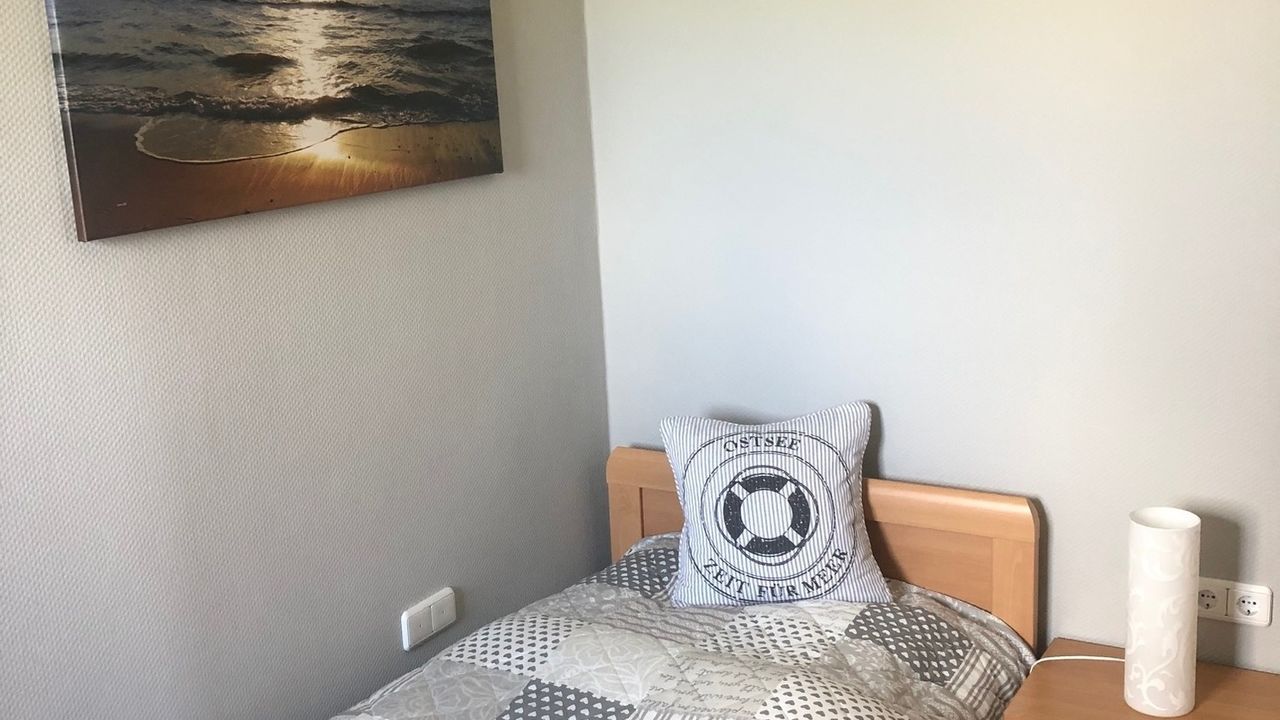 Romantisches Schlafzimmer mit Doppelbett und einem Panoramablick aufs Meer. Genießen Sie bereits morgens beim Aufwachen einen herrlichen Blick auf die Ostsee und starten Sie entspannt in den Tag !!! Besonderen Wert haben wir außerdem auf eine hochwertige und mediterrane Einrichtung gelegt. Darüber hinaus stehen Ihnen hier ein Fernseher mit DVD-Player, ein spezieller Wellness-Wecker sowie zwei kleine Nachttische zur Verfügung. Im zweiten Schlafzimmer erwarten Sie unter anderem zwei separate Einzelbetten sowie ebenfalls die typisch verzierten Deckenleisten. Blickdichte Jalousien, komfortable Federkernmatratzen sowie verstellbare Lattenroste (sowohl im 'Romantikschlafzimmer' als auch im Gäste-/Kinderzimmer) sorgen für hohen Schlafkomfort. Eine weitere Besonderheit ist unser begehbarer Schrank/Abstellraum mit direktem Zugang zum Wohnzimmer (u. a. mit kleinem Safe).