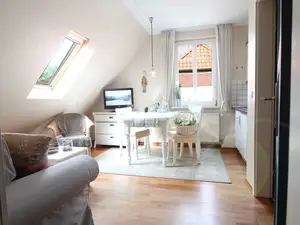 Unsere gemütliche Ferienwohnung im ersten Obergeschoss ist etwa 35 qm groß und ideal für zwei Personen. Der Blick aus den Fenstern fällt direkt auf die Alte Inselkirche – ein ganz besonderer Ort mit Geschichte und Seele.