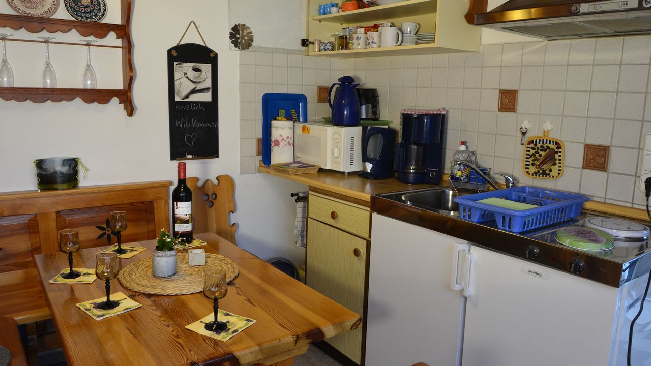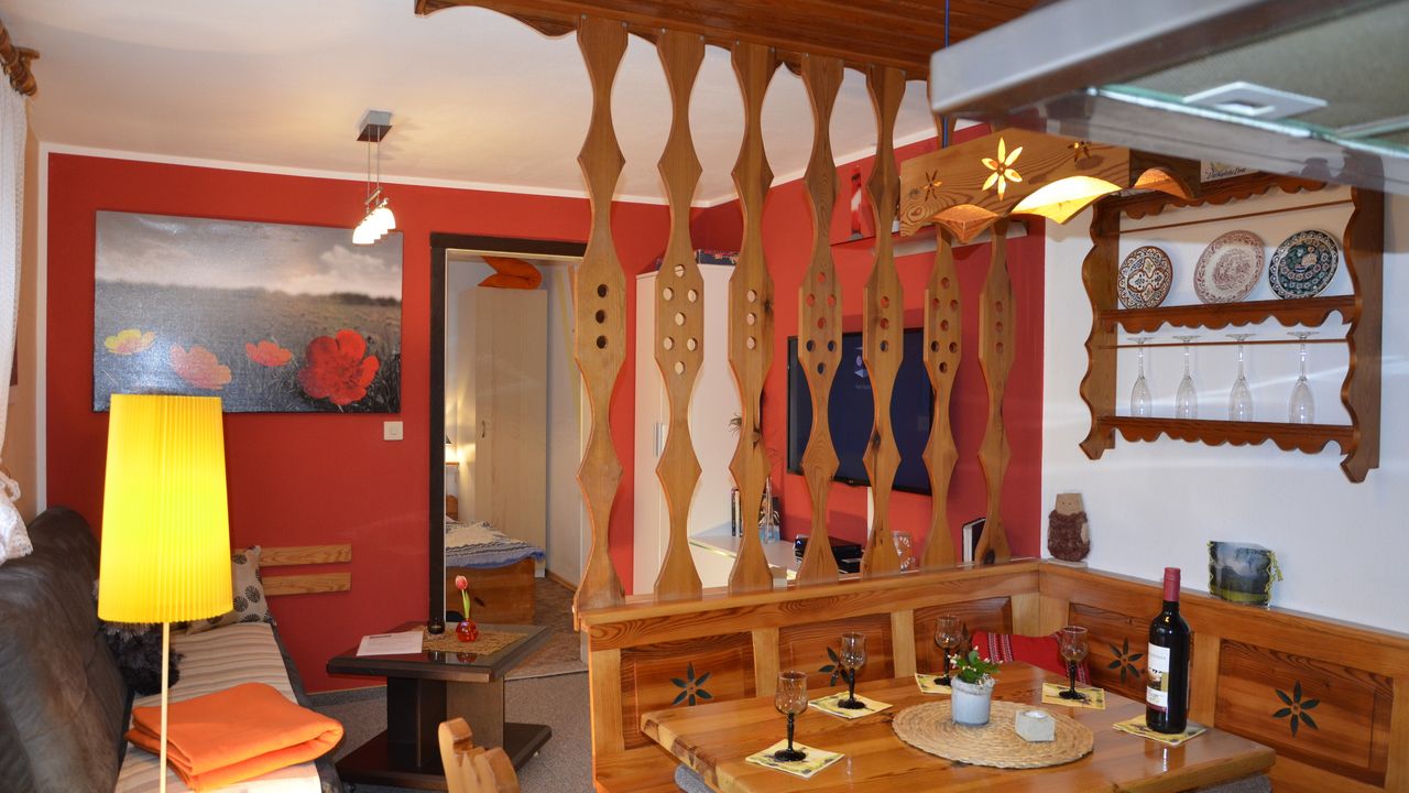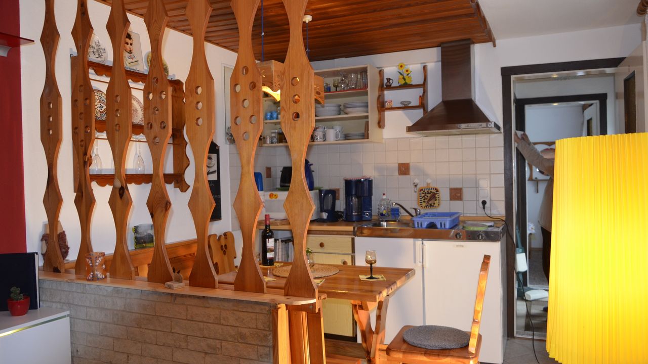 Das Ferienhaus ist ein Flachbau mit 2 getrennten Schlafzimmern, einem Wohnaufenthaltsraum der durch einen Raumteiler den vollständig eingerichteten Küchentrakt im Bauernstil, mit Eckbank, Eßtisch und Stühlen vom Wohnraum teilt.