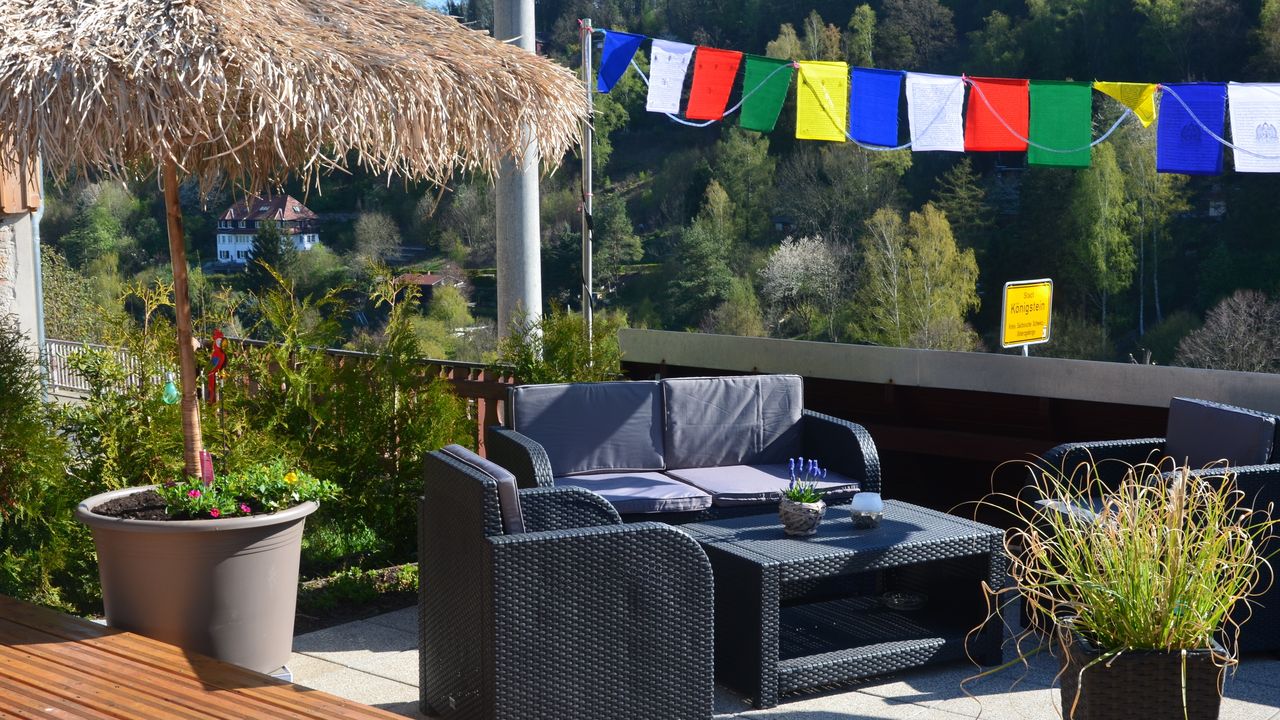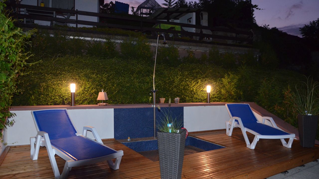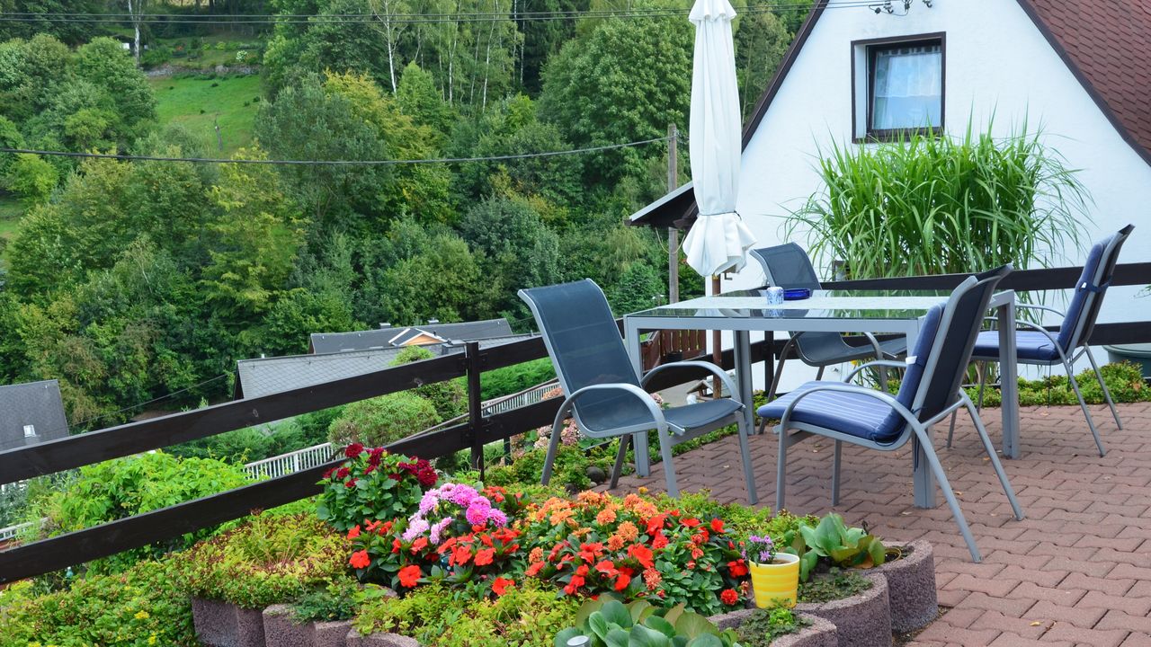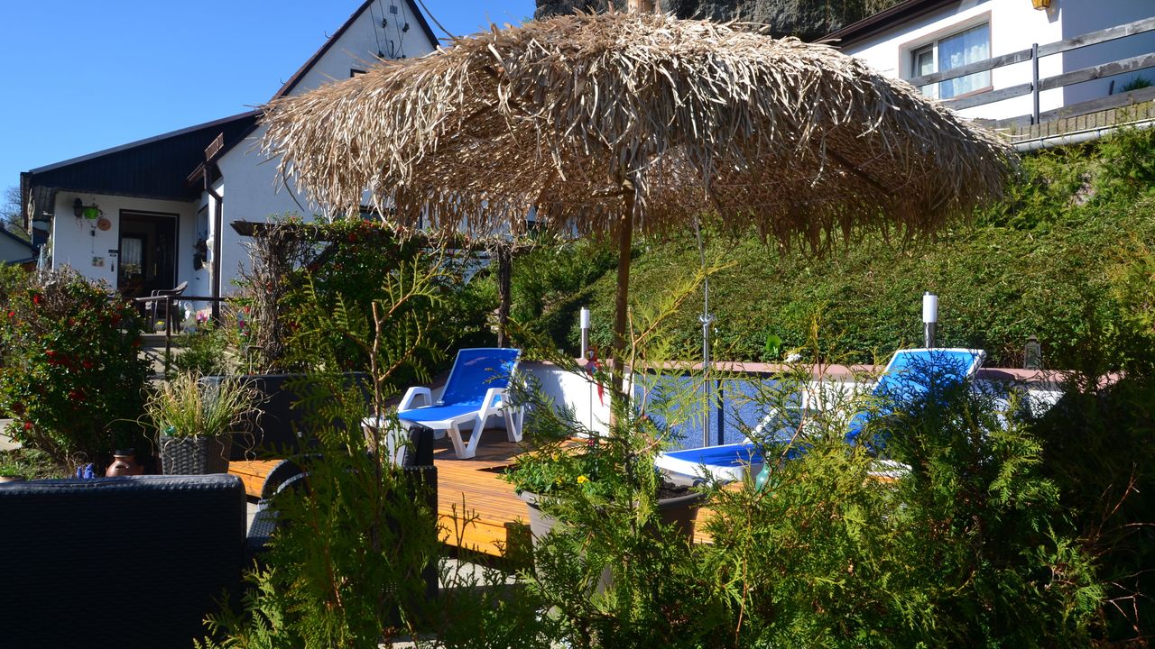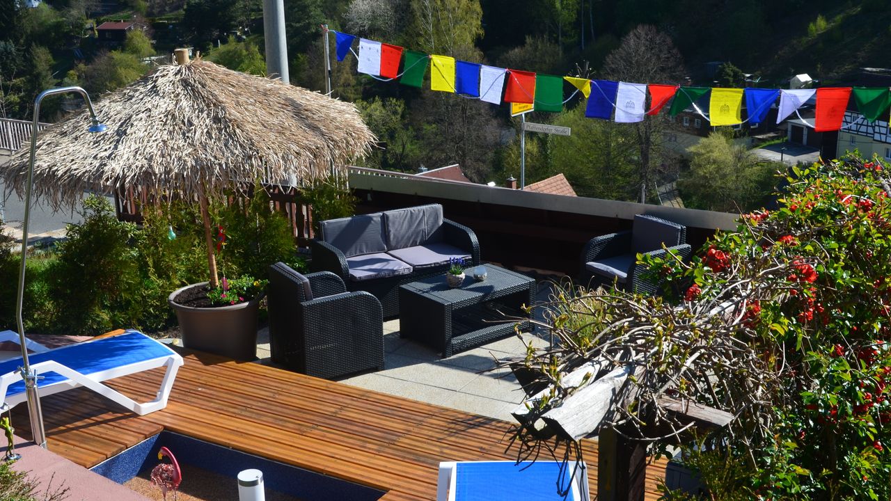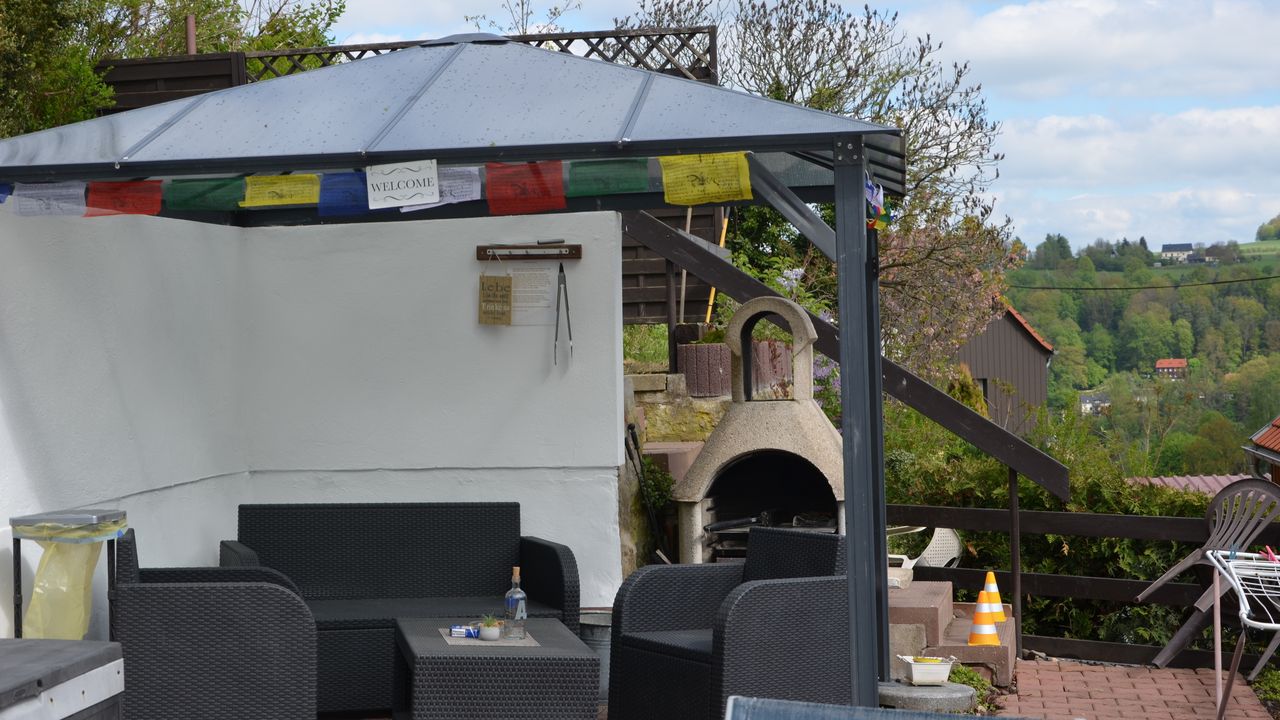 Zur Ferienwohnung gehört eine große Terrasse (mit Gartenmöbeln und Liegen) von der man einen wundervollen Blick zum Lilienstein genießt. Ein Gartenpavillon in einer geschützten Ecke mit Rattanmöbeln lädt am Abend zu gemütlichen Stunden ein. Gleich daneben ist eine Grillstelle vorhanden.Eine zweite Terrasse mit Außendusche (Kalt - Warm) steht allen unseren Urlaubern im Haus 1 und 2 zur Verfügung. Am Haus befindet sich ein Stellplatz für das Auto.