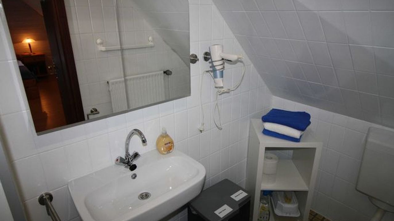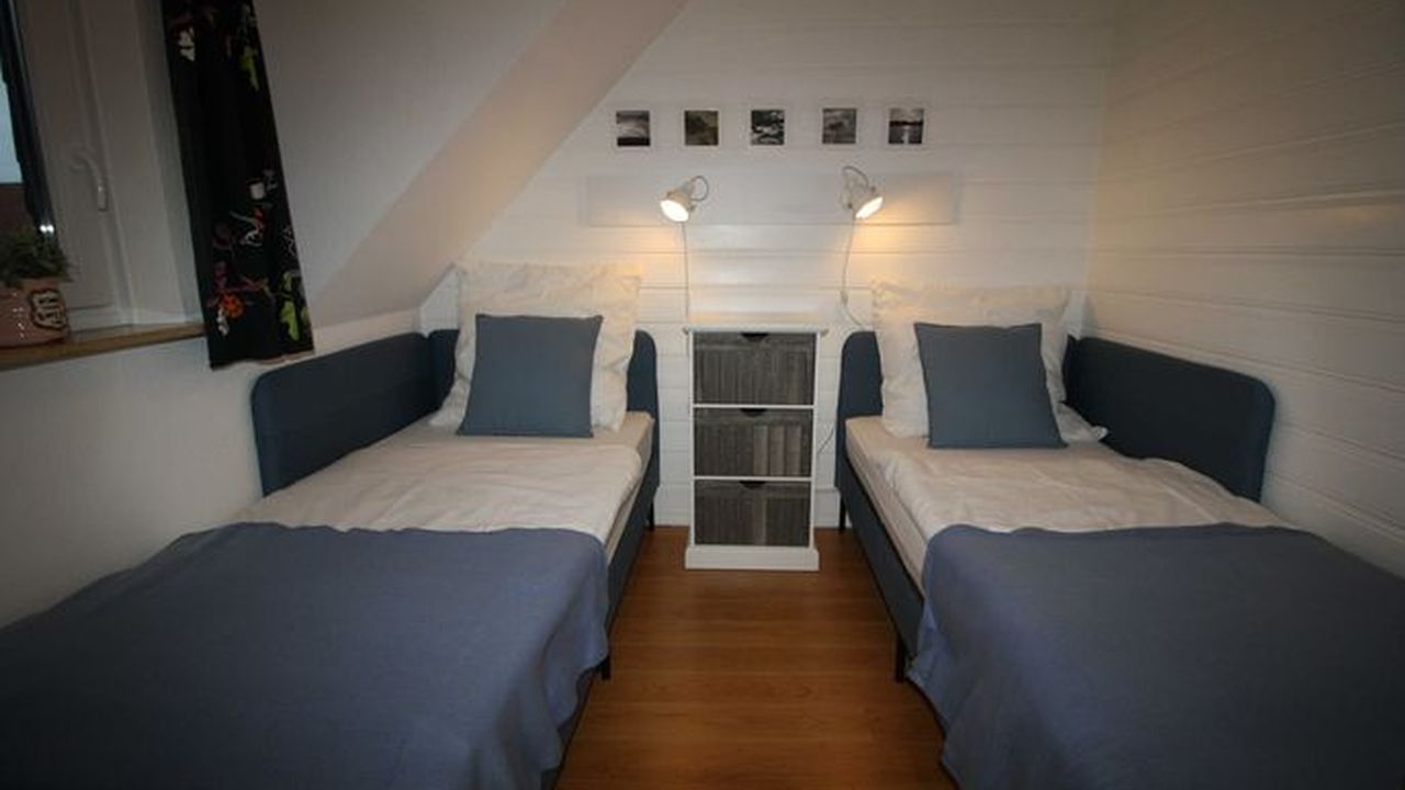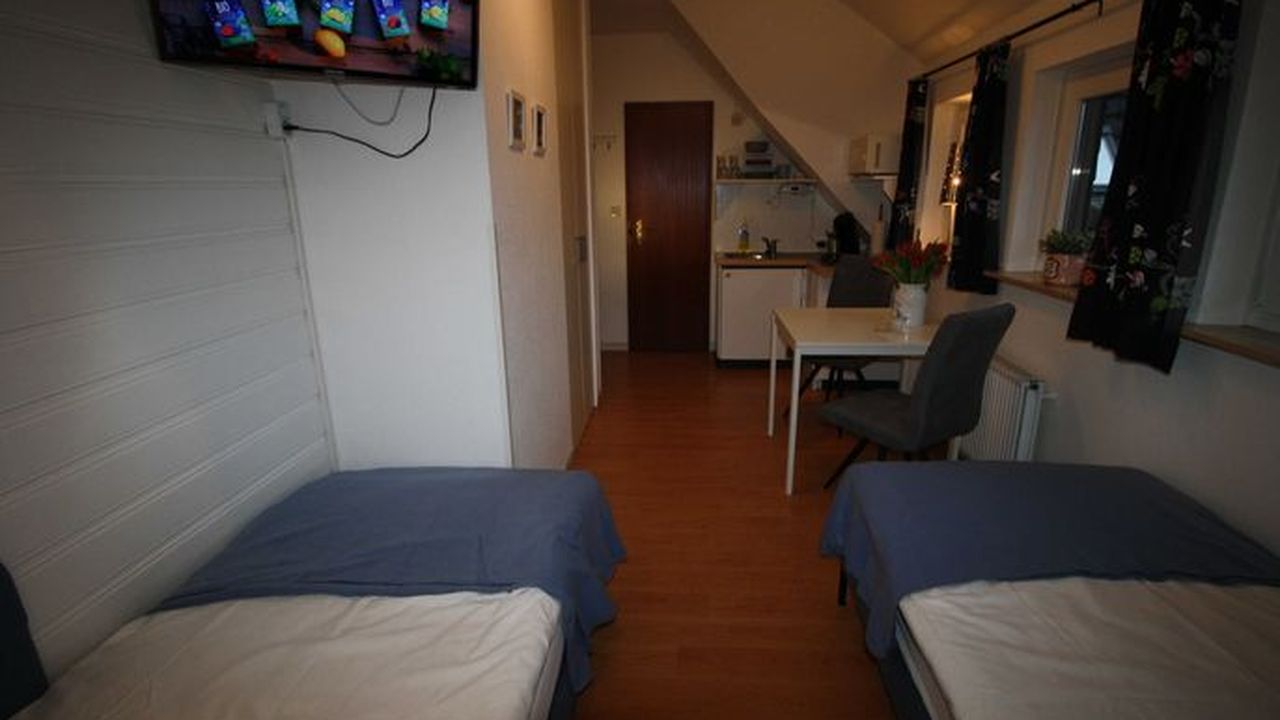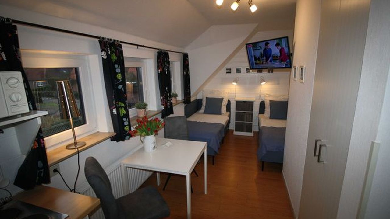 Das Appartement liegt im Obergeschoss und ist 18 qm groß. Es gibt einen Wohn-/Schlafraum mit 2 Einzelbetten, außerdem eine kleine Kochnische mit Kühlschrank, Kochfeld, Mikrowelle und Senseo-Kaffeemaschine. Zur Ausstattung gehört ein großer