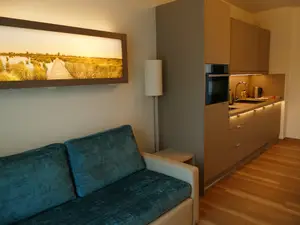 Unser Apartment ist zirka 40 qm groß und besticht durch zeitloses und geschmackvolles Design. Ein abgeschlossenes Schlafzimmer und eine offene Wohnküche mit gemütlicher Sitzecke schaffen heimelige Urlaubsmomente. Die Apartments bieten Paaren und kleinen Familien puren Genuss in privater Atmosphäre.Für gemütliche Abende ist die Ferienwohnung mit einem Fernseher ausgestattet.