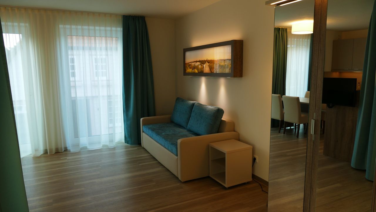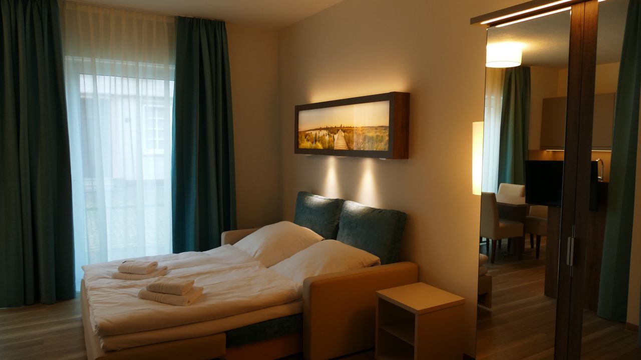 Dieses Apartment bietet den gleichen Komfort, wurde aber speziell für Gäste mit Handicap entwickelt und ist komplett Barrierefrei. Das Badezimmer verfügt über eine befahrbare Dusche, ein unterfahrbares Waschbecken und Haltegriffe an der Toilette. Das Zimmer ist großzügig geschnitten und hat entsprechende Türbreiten.Für gemütliche Abende ist die Unterkunft mit einem Fernseher ausgestattet.