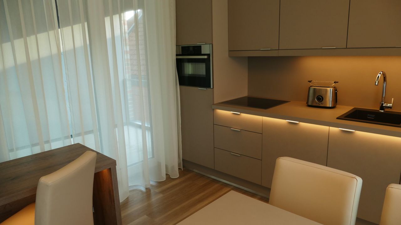 Besonders beliebt bei den Gästen der Ferienwohnung: der schöne Balkon. Die gut ausgestattete Küche besitzt unter anderem einen Kühlschrank, einen Herd zum Kochen und sogar eine Spülmaschine.