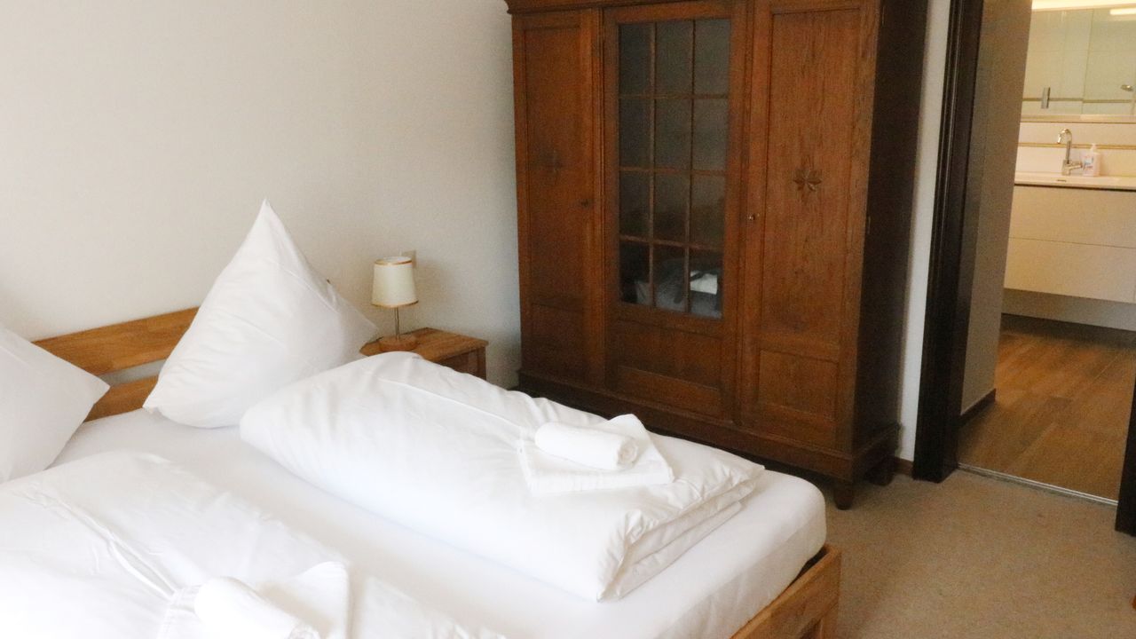 - Schlafzimmer 1 (für 2 Personen): 1 Doppelbett, Schrank, Schreibtisch und direkter Zugang zum Badezimmer