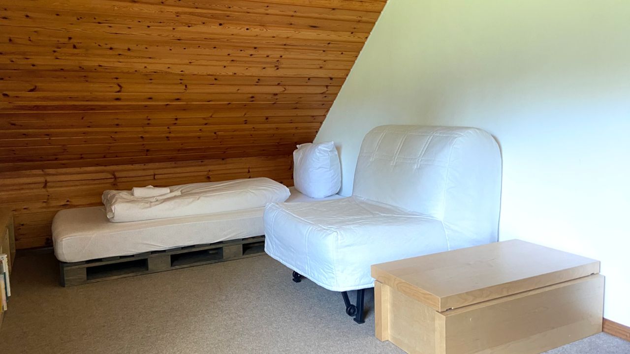 - Schlafzimmer 2 (für 2 Personen): 1 Einzelbett und 1 Schlafsessel, Schrank und Schreibtisch