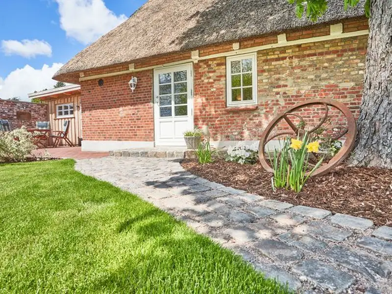 Sie betreten das Grundstück über die Auffahrt, auf der sie auch bequem an der E - Ladestation Ihr Elektroauto gegen Entgelt aufladen können. Ein mit Kopfsteinen gepflasterter Weg führt Sie durch den Garten zum reetgedeckten Ferienhaus.