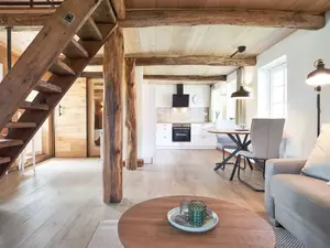 Willkommmen in der Kleinen Oase! Hier begrüßen Sie ein angenehmes Klima und erdende Farben. Bei der Renovierung wurden vor allem Naturmaterialien verwendet. Die Wände wurden mit Lehm auf einer Holzfaserdämmung verputzt und zum Teil mit einer atmungsaktiven Lehmfarbe weiß gestrichen. Alle alten Balken des Hauses wurden in liebevoller Kleinstarbeit freigelegt und mit Leinöl restauriert. Die Kombination aus Holz und Lehm ergibt ein irdenes Aroma und lässt Sie sogleich entspannen. Die Farben der Inneneinrichtung holen die Natur ins Haus. Der sandige Lehmputz und das Grün der Dekoration ergänzen sich gemeinsam mit den Holzbalken und den handgefertigten Eichen-Fensterbänken zu einer Oase. Der Fußboden im Wohn- und Küchenbereich ist gefliest und wird über eine Fußbodenheizung temperiert. Hinter dem bequemen Ecksofa befindet sich ebenfalls eine Wandheizung. Besonders an kalten Tagen hat man dadurch das Gefühl, ein Ofen würde die Wohnung heimelig erwärmen, während Sie Ihren Abend vielleicht bei einem Glas Wein vor dem Flat-TV ausklingen lassen. Die Wandbeleuchtung illuminiert dabei den Raum in warmen Licht.