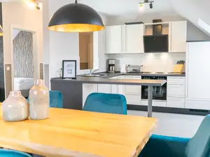 (inkl. Herd, Backofen, Kaffeemaschine, Spülmaschine, Kühlschrank, Besteck, Wasserkocher und Geschirr)