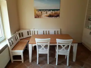 Unser frisch renoviertes Haus bietet auf 120 qm Wohnfläche ein behagliches Wohnzimmer mit Kaminofen und ein großes Esszimmer mit einer gemütlichen Recamiere. Über den Flur gelangen Sie in die vollausgestattete neue Wohnküche mit gemütlicher Sitzecke. Die Küche ist mit Spülmaschine, Mikrowelle, Backofen, Ceranfeld, Kühlschrank, Gefrierschrank, Kaffeemaschine, Toaster und Wasserkocher ausgestattet. Im Erdgeschoss befindet sich außerdem auch noch ein barrierefreies Duschbad mit Waschmaschine. Über eine kleine Treppe gelangen Sie in das Obergeschoss mit den drei Schlafzimmern. Zwei davon haben ein Doppelbett und eines ist mit zwei Einzelbetten bestückt. Das zweite Badezimmer im Obergeschoss ist mit einer Badewanne und einer Dusche ausgestattet.Auf der uneinsehbaren Terrasse können Sie den Abend bei einem Glas Wein oder Bier mit den letzten Sonnenstrahlen genießen. Für Ihren PKW gibt es neben dem Haus einen privaten Stellplatz. Drei weitere öffentliche Stellplätze befindeen sich nur 50 m vom Haus entfernt. Das Haus liegt am Ende der schmalen Straße in einer ruhigen Sackgasse.