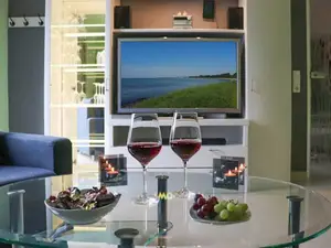 Im Wohnzimmer der Fewo finden Sie eine gemütliche Sofalandschaft (zum Doppelbett umfunktionierbar) mit Lesesessel und einen TV-Schrank mit großem Flachbildfernseher (3-D Gerät - Bluray-Player).