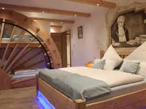 45 m², 1 Schlafbereich mit Doppel-Boxspringbett und einem Floßsteg, 1 Wohnraum mit weiterer Schlafmöglichkeit für 2 Personen, Panorama-Ofen mit Knistereffekt, 1 Badezimmer, Bluetooth Lautsprecher im Bad und Wohnraum, 2 Flachbildschirme, Minibar, Safe, Bar mit Hocker, Ost-Balkon mit Weitblick, Lichtfarbprogramme, WLAN, Induktionsladung für Smartphone, Augmented Reality, Küche im Jagdzimmer