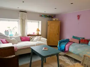 Der Gästebereich befindet sich in der ersten Etage meines Hauses, auf Wunsch kann ein weiteres Zimmer mit zwei Schlafgelegenheiten in der zweiten Etage hinzu gebucht werden. Erreichbar ist das Dachgeschoss über eine schmale Raumspar-Treppe!