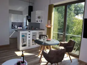 Ferienwohnung im Landschaftsschutzgebiet nahe Zwischenahner Meer. Freuen Sie sich auf erholsame Urlaubstage in Bad Zwischenahn in dieser liebevoll und hochwertig eingerichteten Ferienwohnung inmitten des Landschaftsschutzgebietes. Über den optisch geschickt abgetrennten Vorflur mit Garderobe gelangen Sie in den großzügigen, gemütlichen Wohn-Essraum. Dieser von zwei Sonnenseiten lichtdurchflutete Wohlfühlbereich mit offener Küche lädt zu jeder Jahreszeit zum entspannten Aufenthalt ein. Vom ersten Morgenkaffee bis zum 3-Gänge-Menü können Sie in der top ausgestatteten Küche alles wunderbar zubereiten. Und wenn das Wetter es möglich macht, dürfen Sie dies dann auch auf Ihrer südseitigen Dachterrasse, mit Blick auf den wunderschön angelegten Innenhof und angrenzenden Garten, genießen. Auf der Leder-Récamiere lässt es sich bequem lesen, Musik hören, mit 55“ fernsehen oder einfach nur träumen. Das farblich harmonisch geflieste Bad ist – wie die gesamte Ferienwohnung – mit einer Fußbodenheizung ausgestattet. Die wohltuende Wärme dieser Heizung spüren Sie auch besonders in der bodengleichen Dusche. Im ruhigen Schlafzimmer können Sie dann, nach einem erlebnisreichen Tag, mit abgedunkelten Plissees neue Energie tanken. Dieser Raum verfügt über eine kleine Schreibtisch-Ecke mit Strom- und USB-Anschlüssen zum Laden von Handys, Tablets etc. Und wenn Sie gern mit Ihrem kleinen Nachwuchs das kinderfreundliche Ammerland erleben möchten, bietet sich besonders die TWEE mit genug Platz für (Ihr) Reisebettchen und Spielfläche an. Ein Hochstuhl und ein Klappbett sind vorhanden. Auch die Unterbringung von Kinderwagen oder Fahrradanhänger ist im Hausflur möglich.Beschreibung der Unterkunft