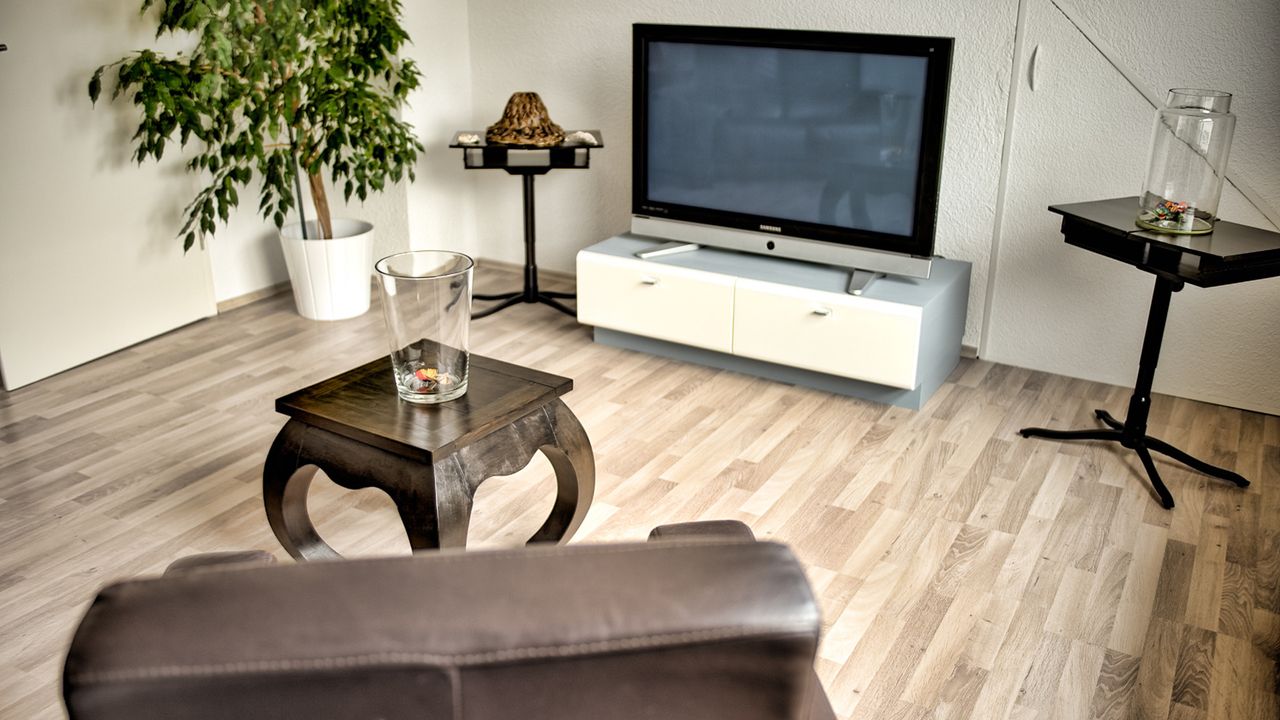 Wohnzimmer: Satelliten Flachbildschirm, 1er Sessel Klappbar als Relax Sessel zum Lesen, 2 er Sofa Klappbar als Relax Sofa.