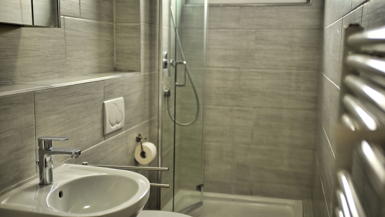 das Tageslicht-Bad mit Dusche, Waschbecken und Toilette. Handtücher, Föhn, Seife und Shampoo Kleenex, Q-Tip sind vorhanden.