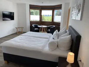 Der 32m² große Deluxe Room ist in der 1. Etage des Ferienhauses untergebracht und hat einen Erker mit schöner Aussicht auf das obere Eyachtal. Ausgestattet ist es mit einem großen Boxspringbett, einer Sitzecke, einem Schreibtisch und einem Tageslichtbad mit Dusche. Eine kleine, aber voll ausgestattete Küche steht für die insgesamt 3 Gästezimmer zur Verfügung. Dort können Sie sich auch zu jeder Zeit kostenfrei Kaffee und Tee zubereiten.Verfügbare Zusatzleistungen