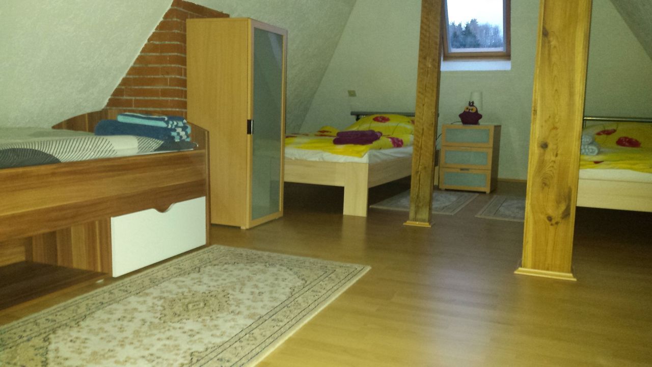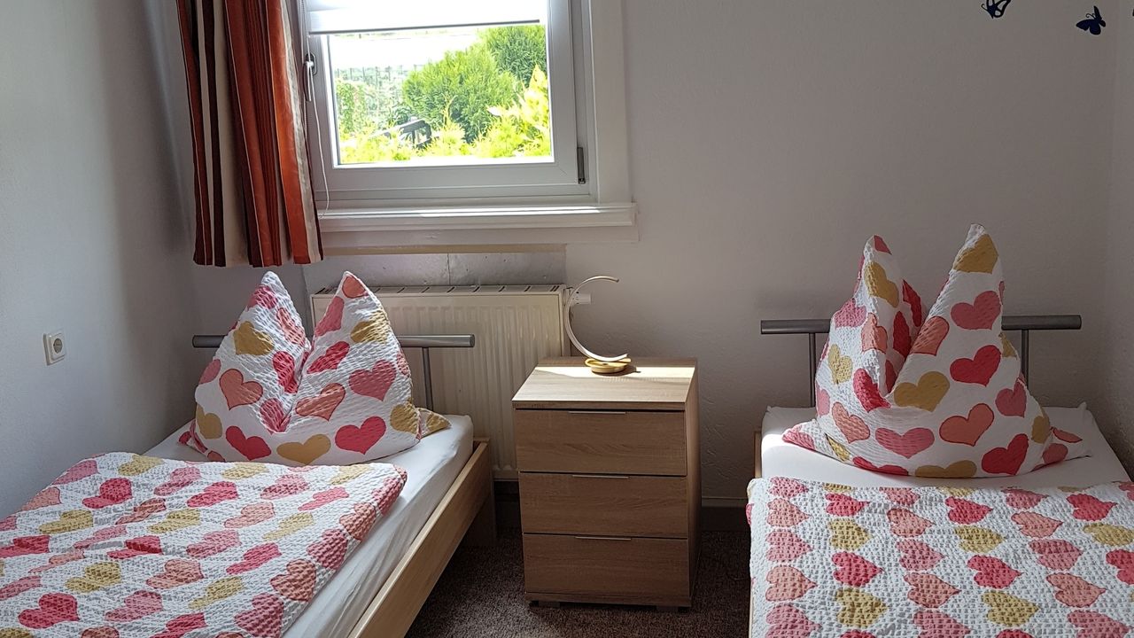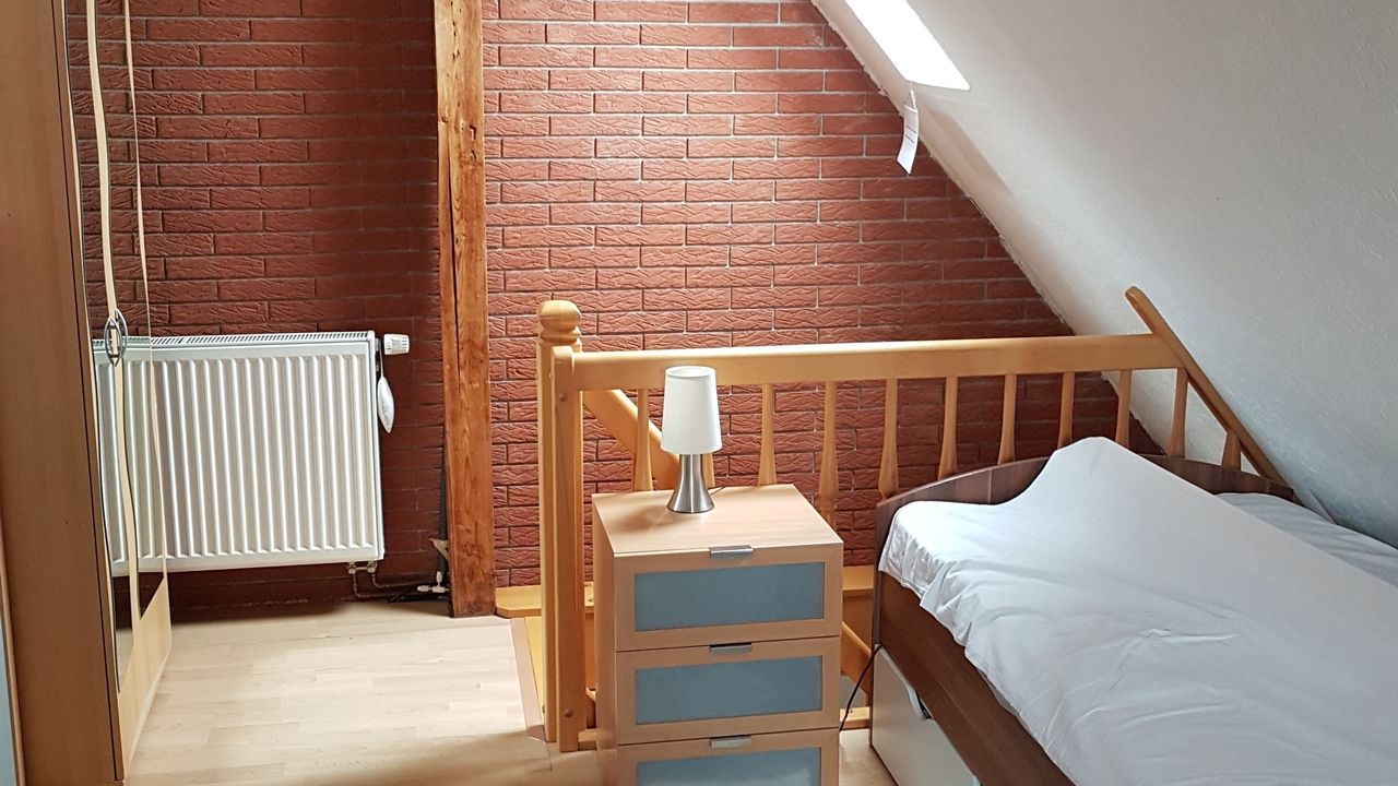 Das Schlafzimmer ist mit einem Doppelbett und einem Einzelbett ausgestattet. Das Doppelbett kann in zwei Einzelbetten umgewandelt werden. Ein Kleiderschrank mit Spiegel ist vorhanden. Das Schlafzimmer befindet sich unter dem Dach. Bei sommerlichen Temperaturen heizt sich dieser Raum natürlich etwas auf.