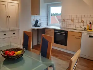 Die Ferienwohnung mit 75 m² Wohnfläche befindet sich im 2. Stock und bietet Platz für 1-7 Personen (ein Doppelbett, ein Stockbett, ein Bett mit ausziehbarem Erweiterungsbett, und ein optionales Kinderbett).Die komplett ausgestattete Küche mit Mikrowelle, Geschirrspüler, Kühlschrank inclusive Gefrierfach, Herd, Backofen, Kaffeepadmaschine, Toaster und Wasserkocher lässt keine Wünsche offen. Hier befindet sich auch ein Essbereich für 6 Personen und einem optionalen Kinderstuhl.