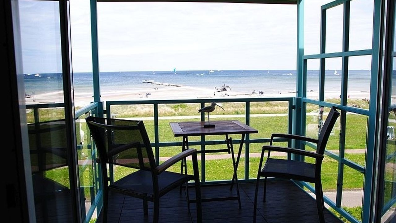 Vom Balkon des Appartements "Fördeblick" genießen Sie den ganzen Tag den Blick auf den Strand und die schöne Kieler Förde.